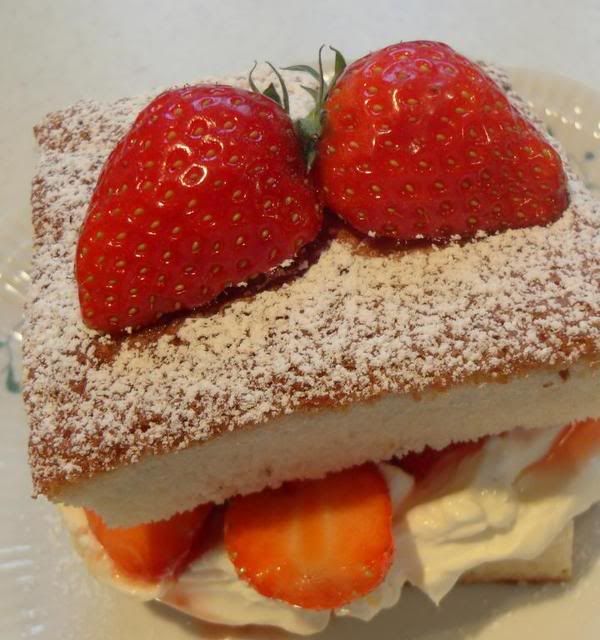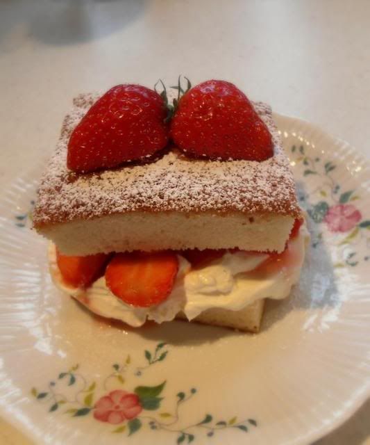 I whipped up a hot milk cake to enjoy these with last night. I just sliced the berries and mixed them with a little bit of sugar and let them sit for a few minutes to release all their juices. Then I split the cooled cake open in the middle and layered it with some freshly whipped double cream and generous spoonfuls of the sliced berries. Heaven on earth . . .