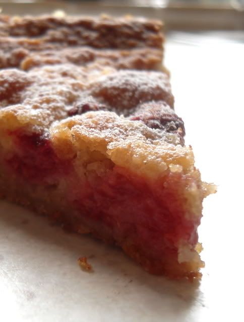 Toss the berries together with the remaining TBS of flour. Shake off any excess, then sprinkle them evenly over top of the batter. Bake in the centre of the oven for about 25 minutes, or until the cake is golden and tests done.