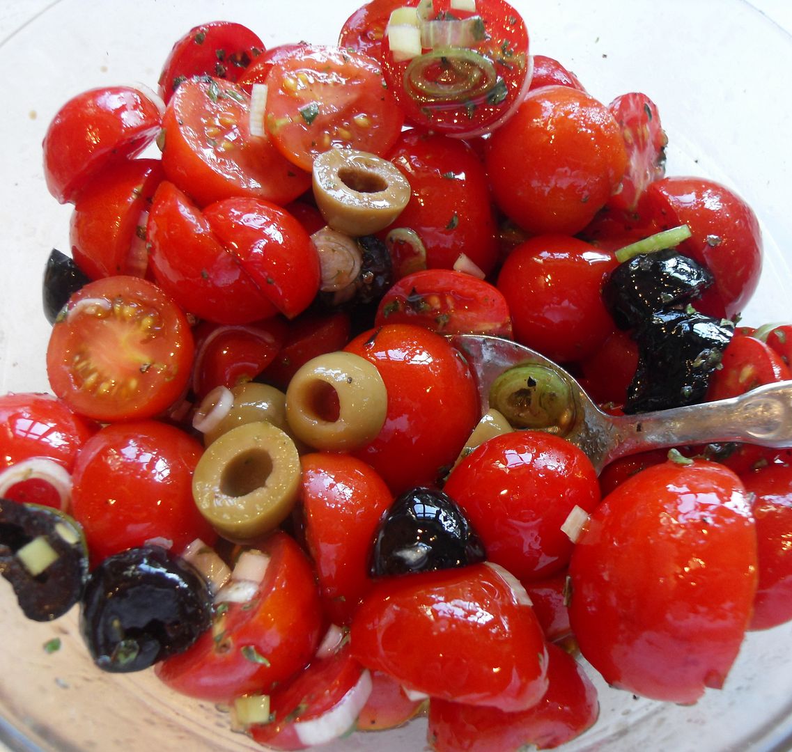 Sweet and tart with the flavours of delicious cherry tomatoes, black and green olives, herbs and delicious Balsamic vinegar . . . spring onions. Eat this with some crusty white bread on the side to mop up all those tasty juices.