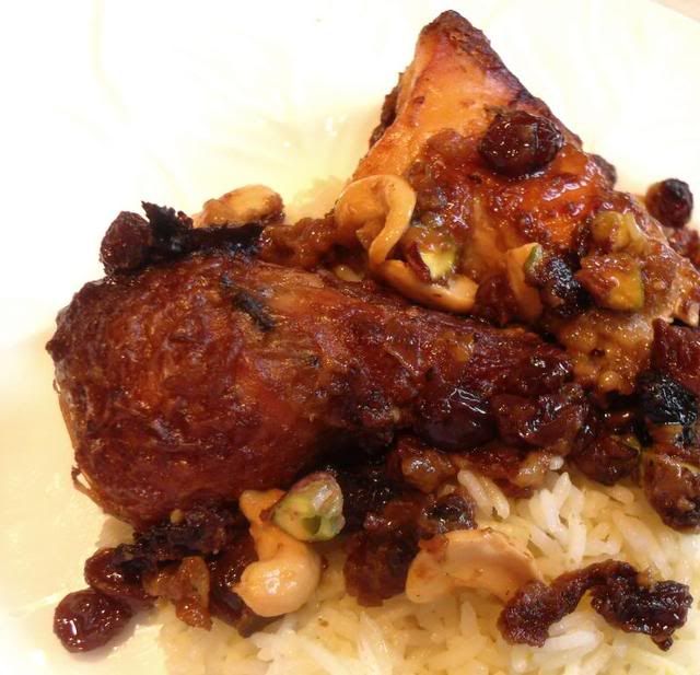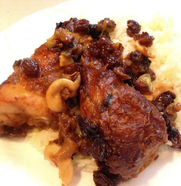 Remove the chicken pieces from the oven and reduce the oven heat to 160*C/325*F. Stir the nuts and sultanas into the sauce. Pour the sauce mixture over the chicken. Cover the roaster and return to the oven and cook for 45 minutes to an hour, until most of the sauce has been absorbed by the chicken and the chicken is very tender. Remove from the oven and serve.