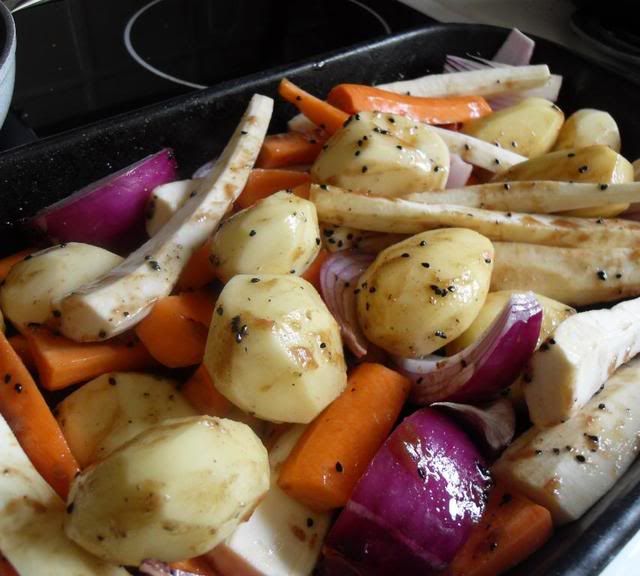 Pre-heat the oven to 220*C/425*F. Place the tamarind paste in a bowl along with the hot water and sunflower oil, whisking it together well. Whisk in the tumeric, cumin seeds and Kalongi. Mix together well. Peel the carrots in cut them half lengthwise. Peel the parsnips and quarter them. Remove the tough inner core. Peel the new potatoes if desired. Place all the vegetables in a large roasting tin along with the onion quarters and garlic cloves. Pour the tamarind mixture over top and disperse amongst the vegetables using your hands. Cover tightly with tinfoil and then bang the pan into the oven and roast them, covered, for half an hour. Remove from the oven and discard the foil. Give the vegetables a good stir and then bury the lamb cutlets down into them, making sure they are coated in the juices. Return to the oven and roast, uncovered, for an additional 40 to 50 minutes, until the chops are cooked and the vegetables are all very tender and gorgeously caramelized on the edges. (Check once in a while and add a bit more water if need be.) When done, serve immediately with some crusty bread.