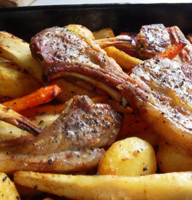 If you like roasted root vegetables, roasted so that they are sweetly caramelized on the outsides and meltingly tender on the insides . . . combined with eastern spice . . . and topped off with lucious lamb cutlets, then this recipe is for you.