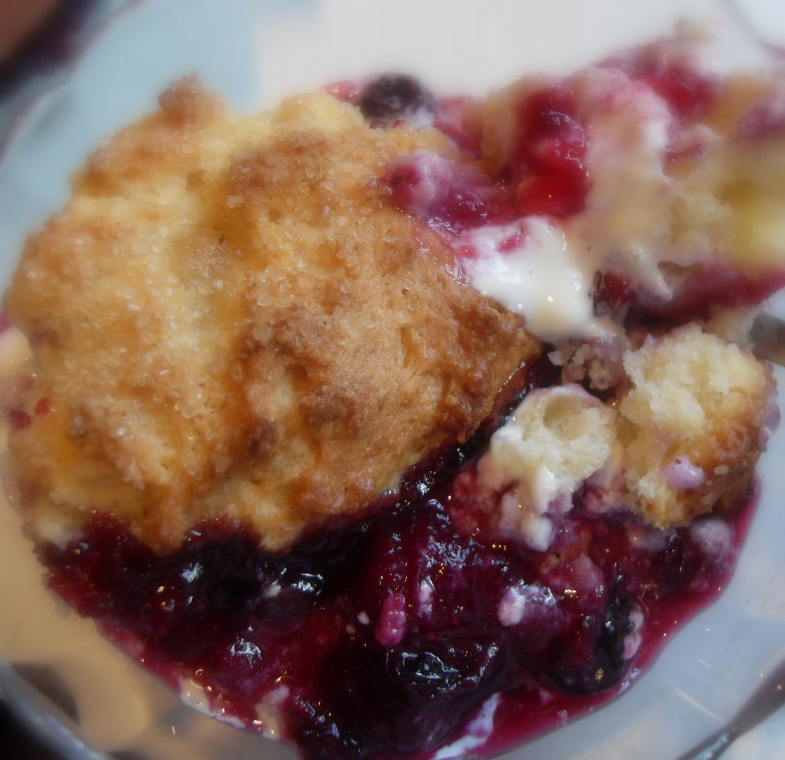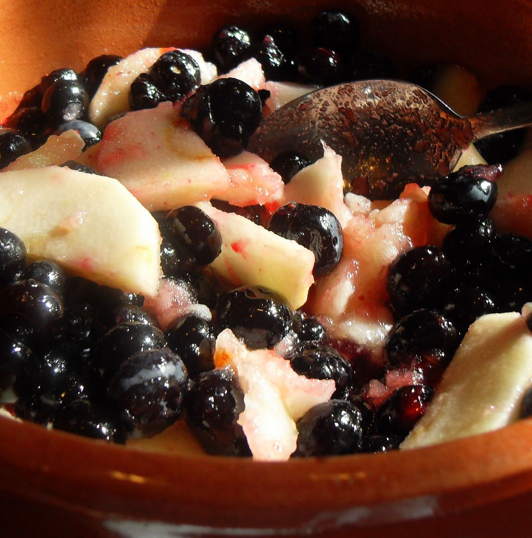 This is so lovely with the sweet blueberries and the tart apples. The hidden surprise of creamy mascarpone cheese really makes it special, as does the crunchy biscuit topping!