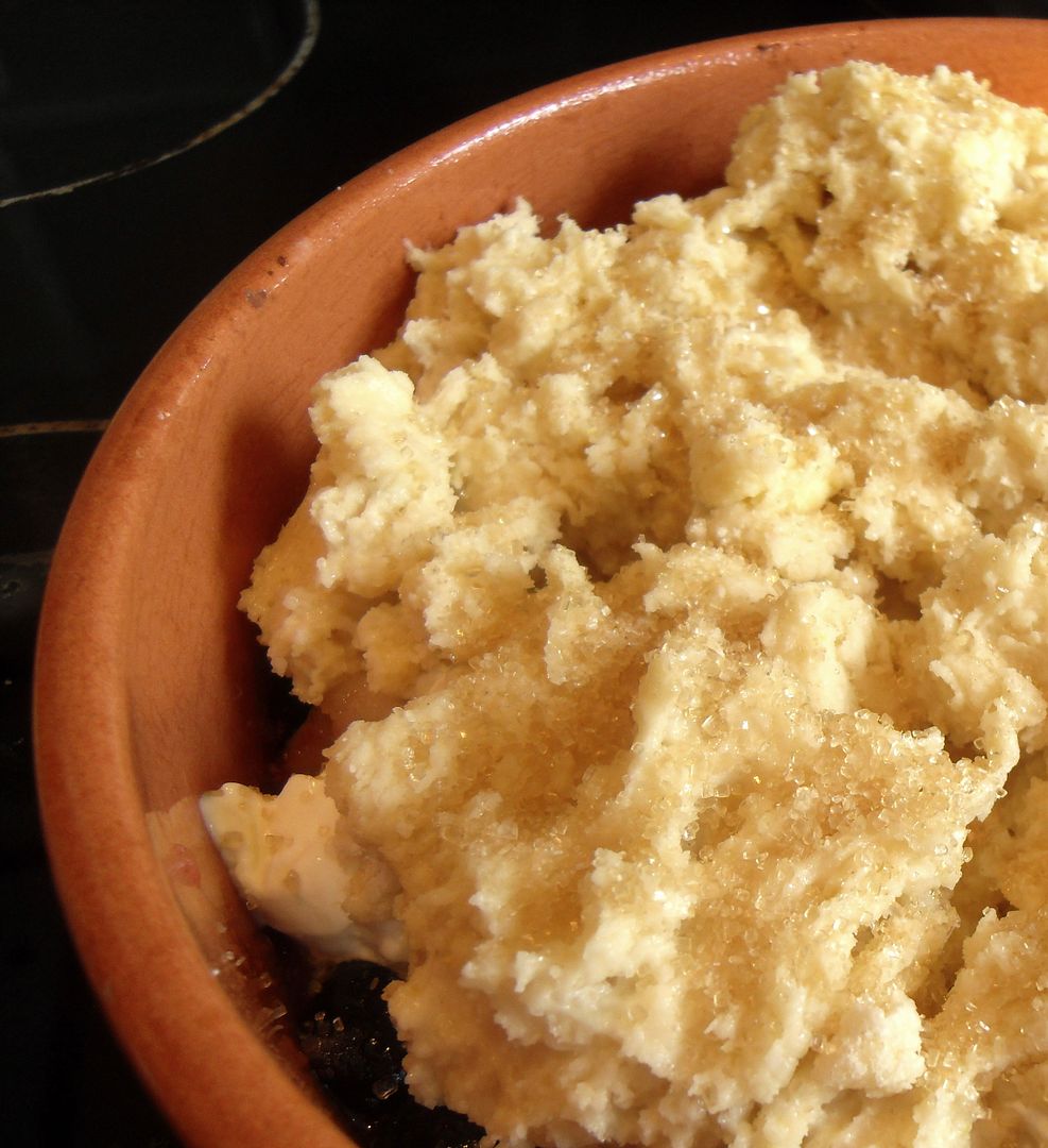 Rub the butter into the flour until it is quite crumbly. Rub the sugar and lemon zest together until quite fragrant. Stir into the crumb mixture. Add the milk all at once and stir to combine. Drop on top of the fruit and mascarpone in big blogs, making it look a bit craggy. Sprinkle the demerara sugar evenly over all. Place on a baking sheet and bake for 25 to 30- minutes, until crusty and golden brown and the fruit is bubbling. Allow to cool for 10 to 15 minutes before spooning into dessert dishes. Serve warm with custard* or vanilla ice cream* if desired.