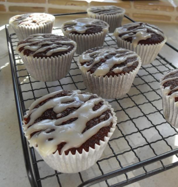 Make the drizzle icing by putting all the ingredients into a microwavable bowl. Place in the microwave and heat for 30 seconds or so. Whisk together really well to blend. Drizzle over the warm muffins.