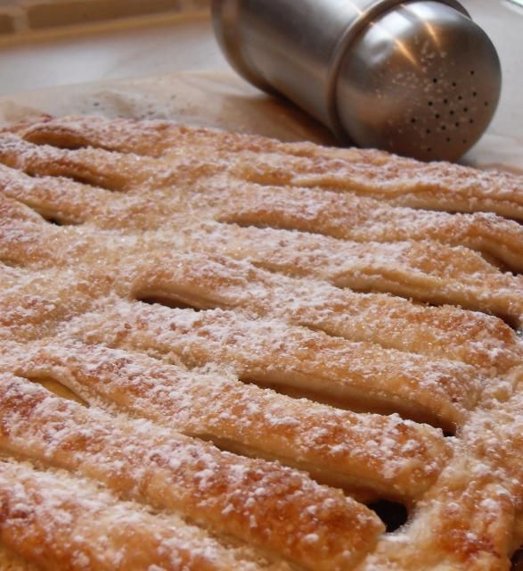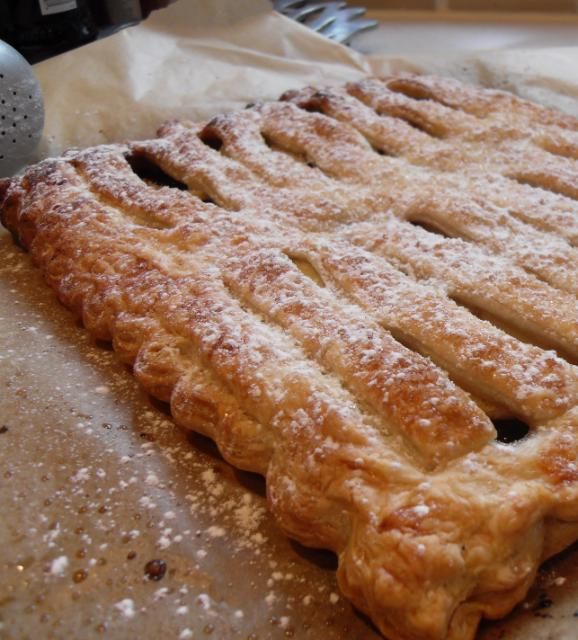 Roll the pastry to a thin oblong, 6 inches wide and 18 inches long. Cut in half crosswise to give you 2 9-inch long strips. Flour one strip lightly and fold in half from both edges to the centre. Make a series of cuts through the folded edges to within one inch of the trimmed edge on both sides.