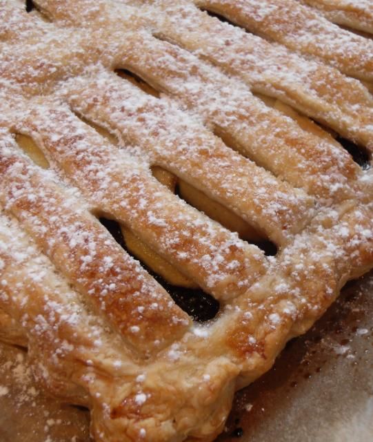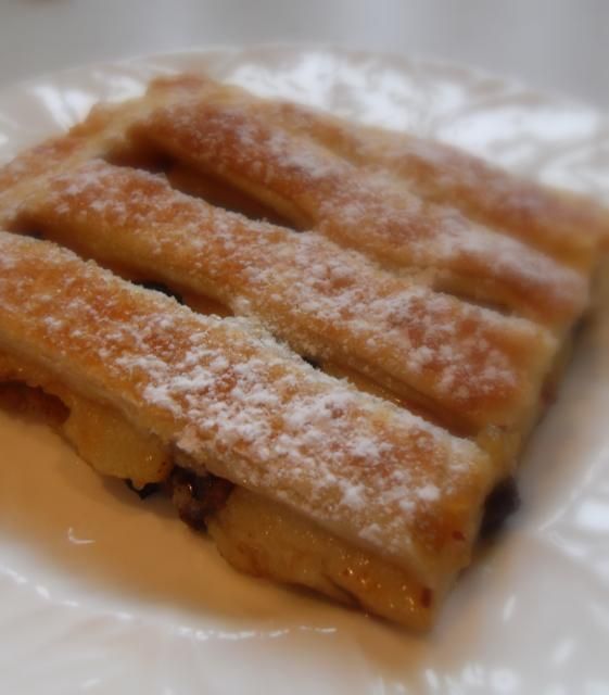 Lightly butter a sheet of parchment paper and place it on a baking tray. Lay the plain piece of puff pastry on top. Spread with the mincemeat to within 3/4 inch of the edge all around. Place the thinly sliced apple on top and then sprinkle with the caster sugar. Dampen the free edge all around with some water. Open out the slashed piece of pastry and lay on top. Seal the edges all around and crimp them together. Brush with some milk and sprinkle with some demerara sugar.