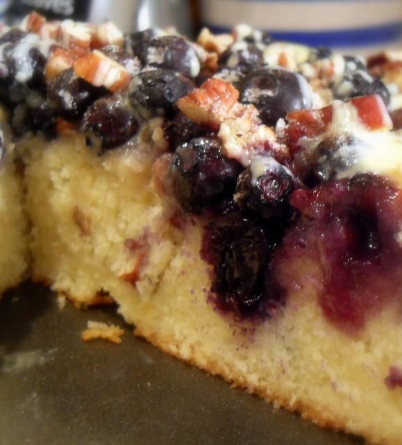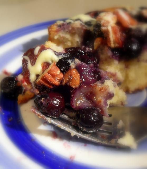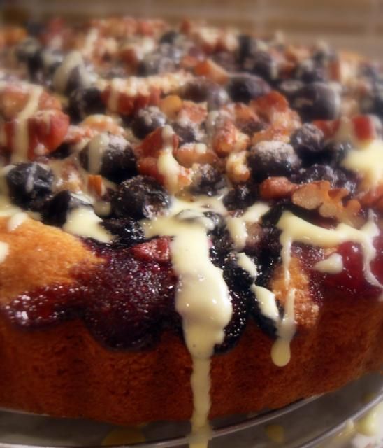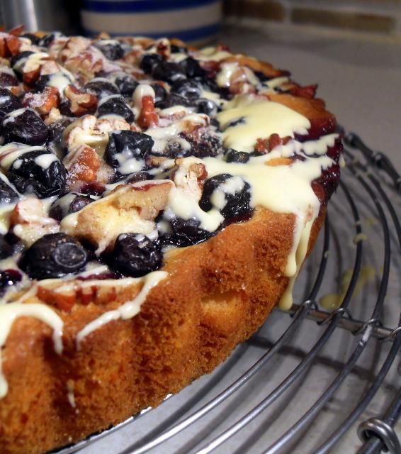 This makes a lovely breakfast treat, bringing the tasty anti-oxidant properties of blueberries to your morning. Nestled atop a tasty sour cream sponge, blueberries happily co-exist along with chopped toasted pecan meats, castor sugar and spice. A crowning icing sugar drizzle makes it complete.