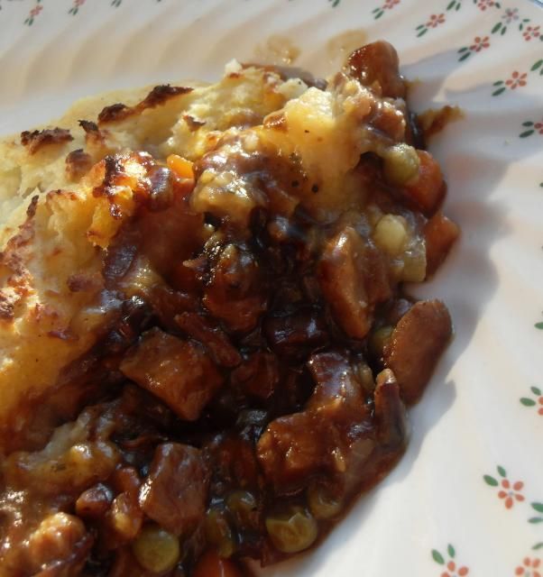 Bang into a pre-heated 200*C/400*F oven and bake until the filling is bubbling and the mash is beginning to brown. Remove from the oven and allow to sit for 5 minutes or so before serving. Delicious!