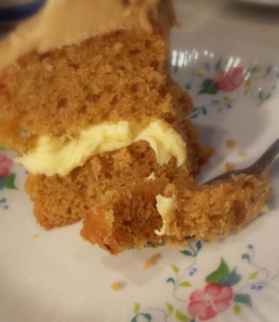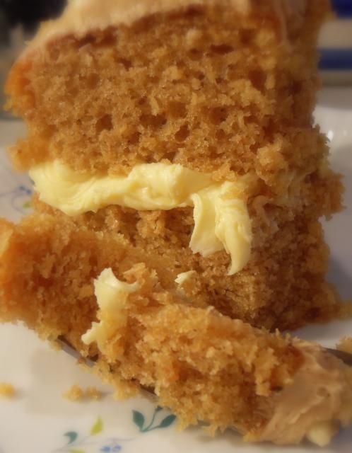 A deliciously moist sandwich cake filled with a lucious buttercream icing and topped with a coffee Creme Au Beurre