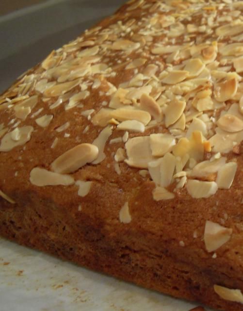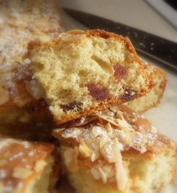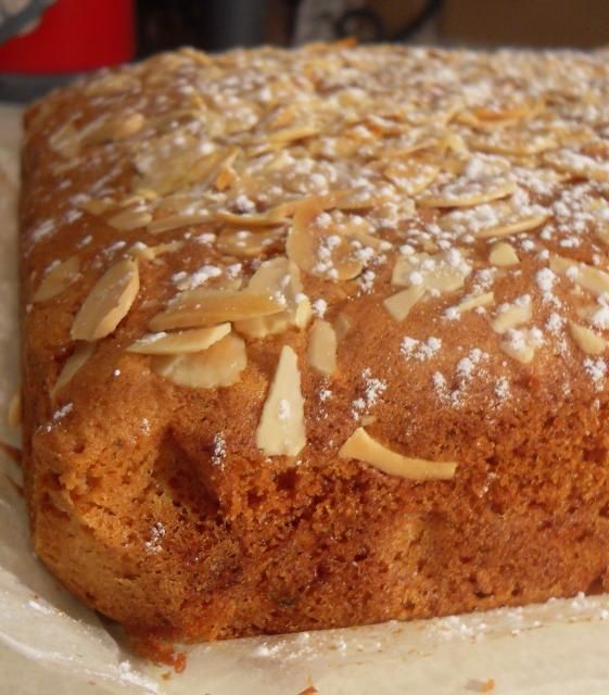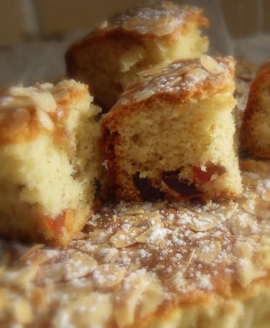 Moist and tasty and stogged full of glace cherries. Nicely crunchy on the top with toasted almonds and just the hint of lemon in the crumb. This went down a real treat! (I am thinking a sticky lemon glaze would be just perfect on this.)