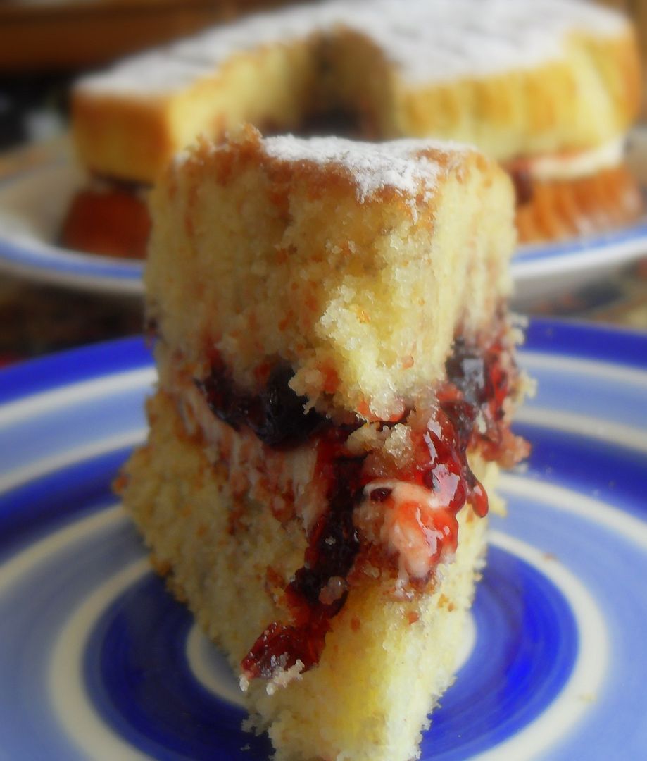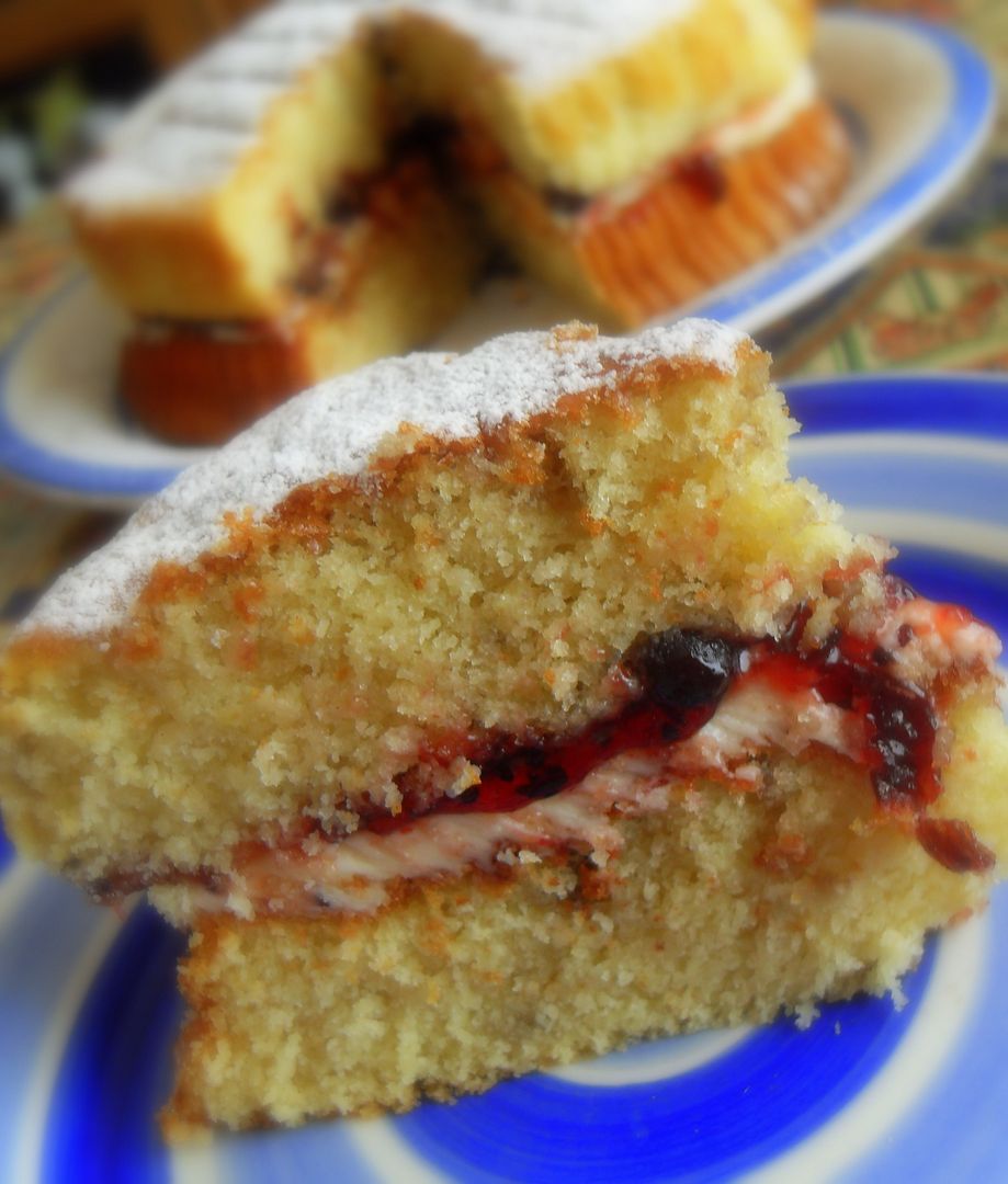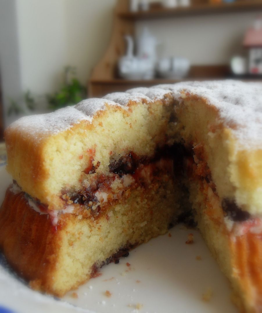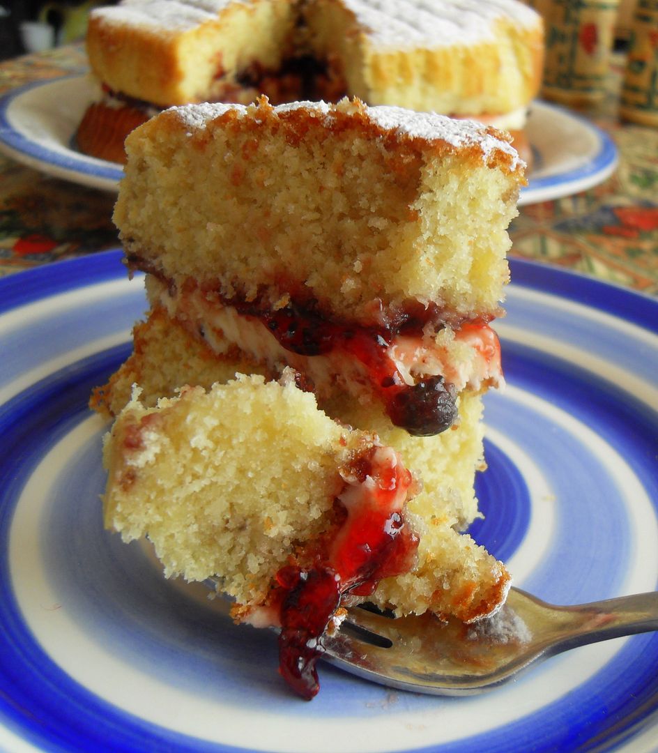 A deliciously moist cake, with ribbons of black currant conserve running through the sponge layers, and filled with tasty vanilla butter cream icing and more conserve. Scrummy yummy!!