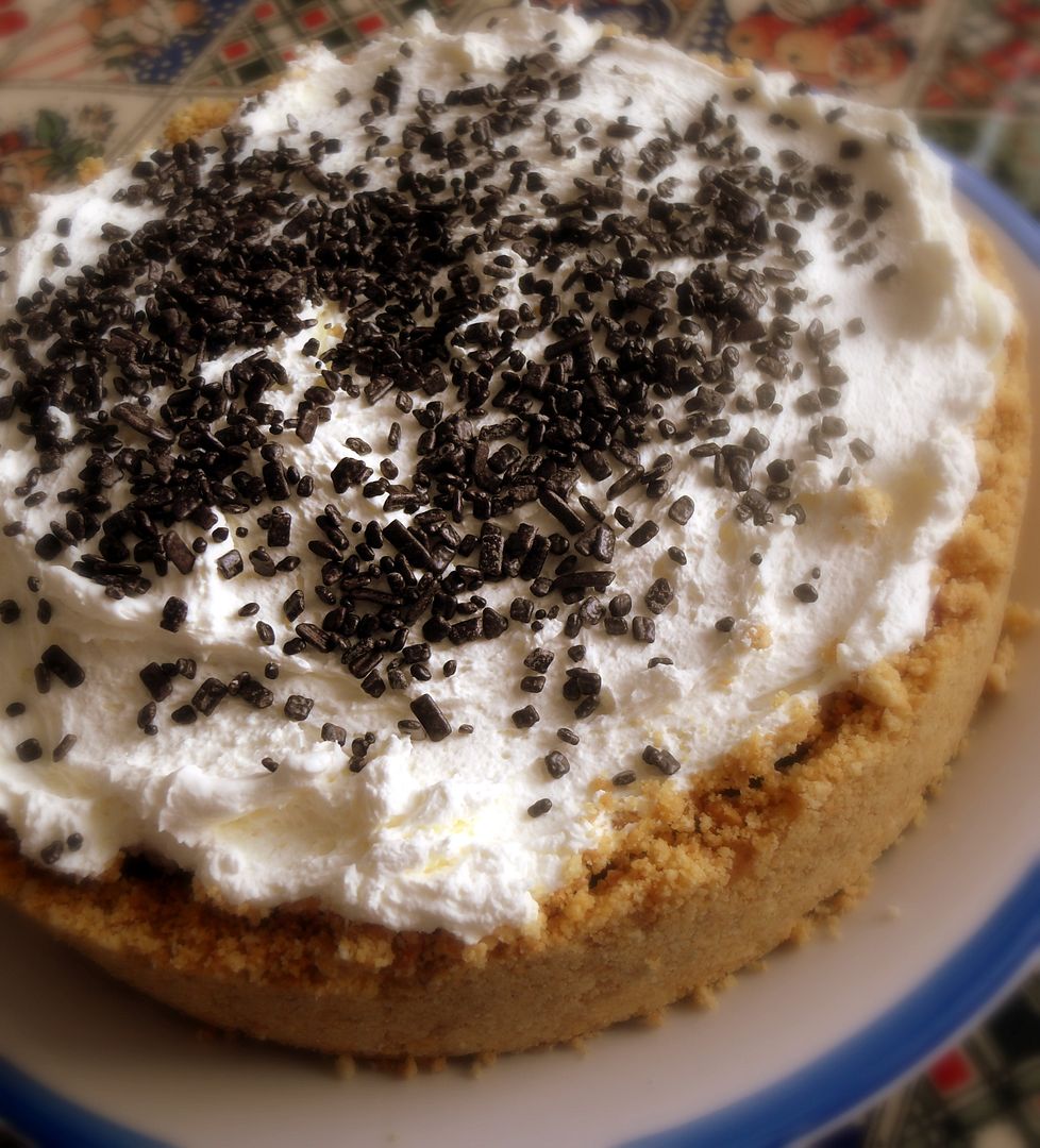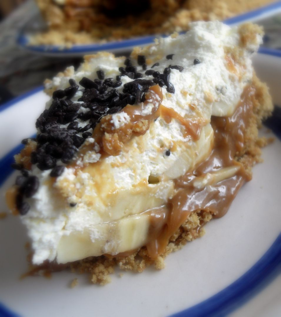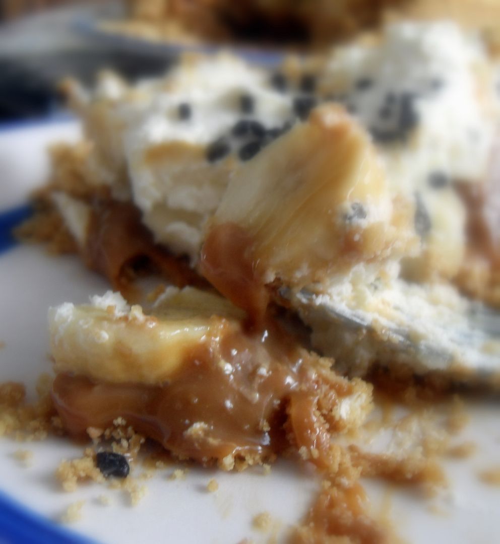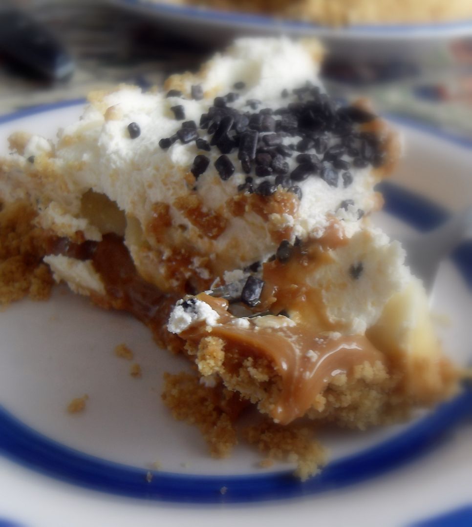 Imagine a tasty, buttery digestive biscuit crust, stogged full of lucious toffee and sliced bananas, slathered with a rich topping of lightly sweetened double cream . . . and a final sprinkling of chocolate bits and sprinkles . . .