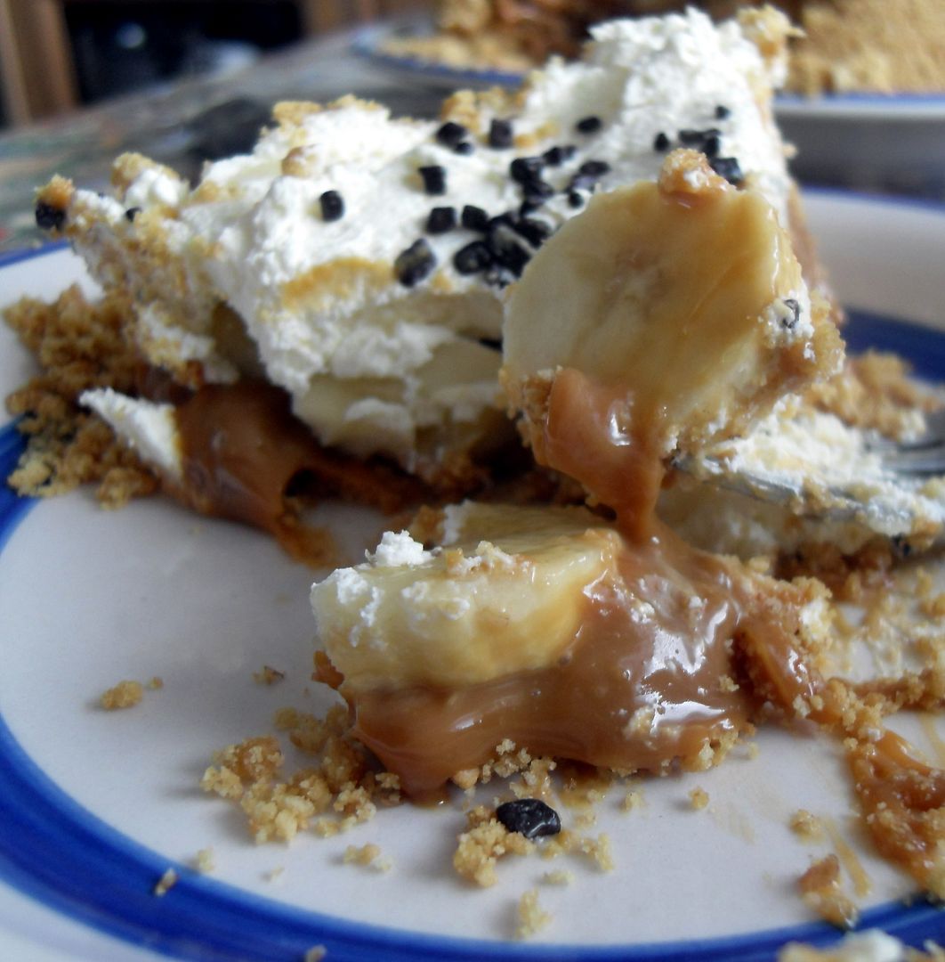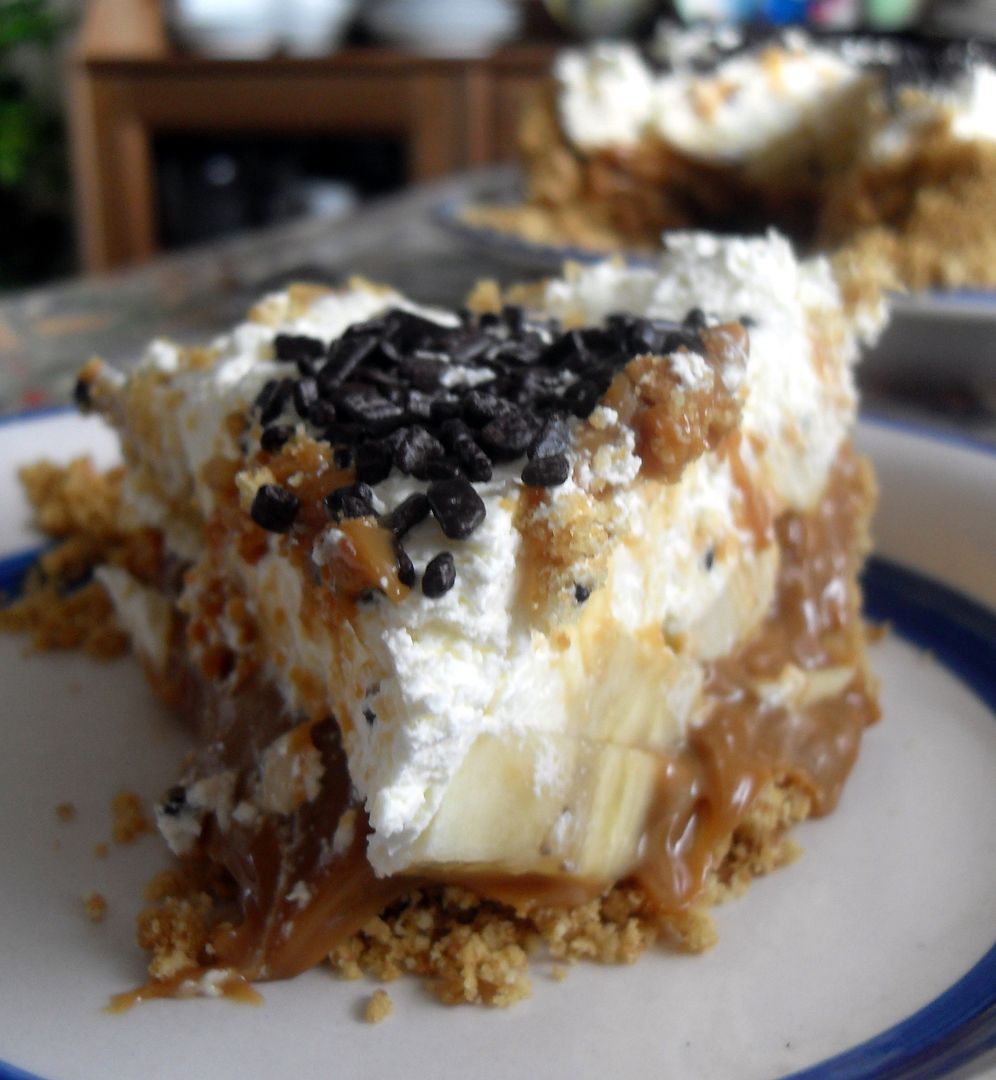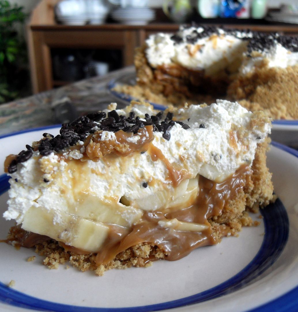 A tasty little creation invented in a restaurant called the Hungry Monk, near Eastbourne in 1971. Digestive crumb base, toffee filling, sliced banana, whipped cream and chocolate sprinkles. What's not to like?