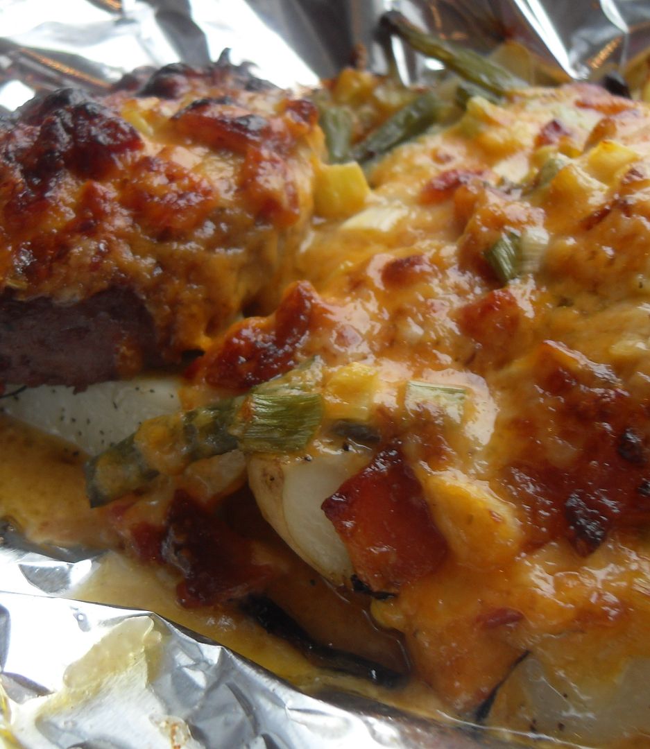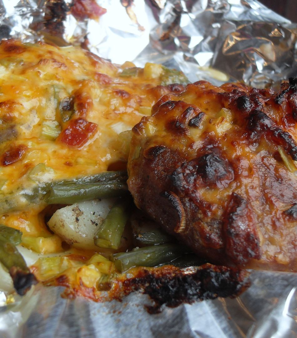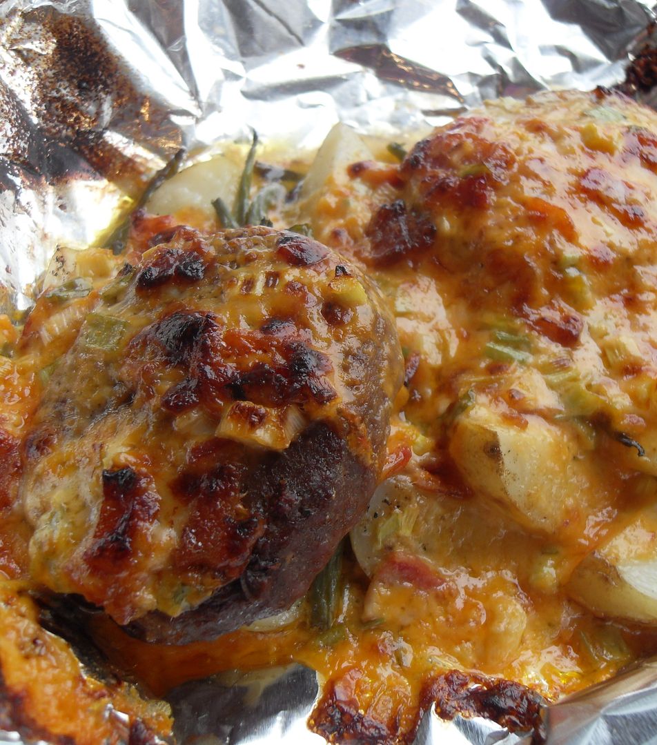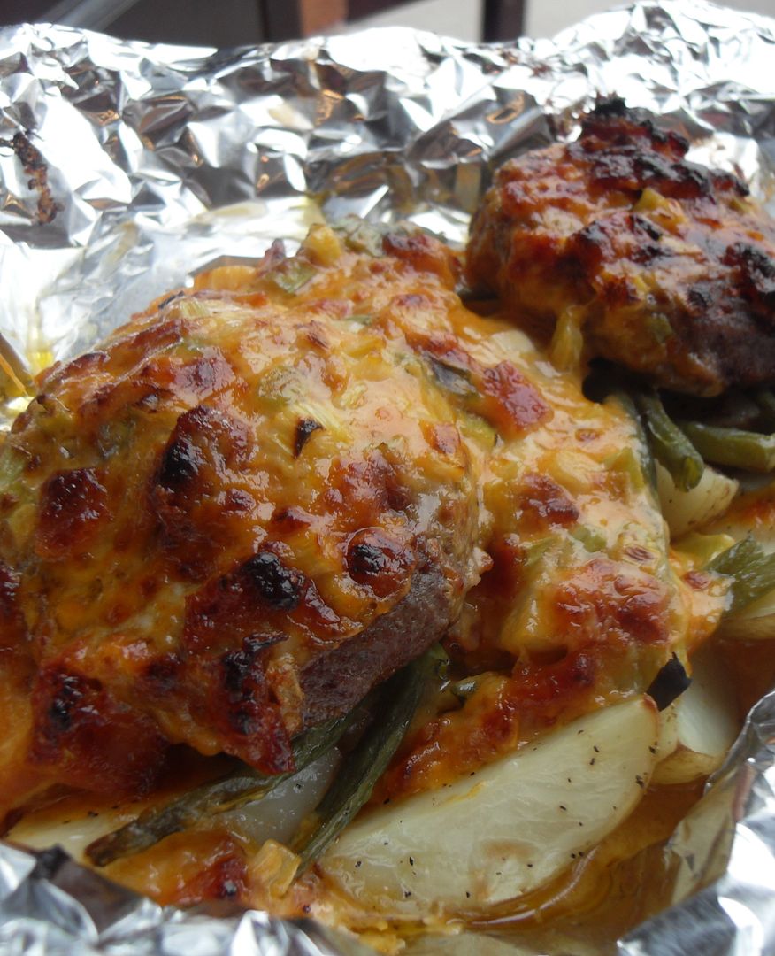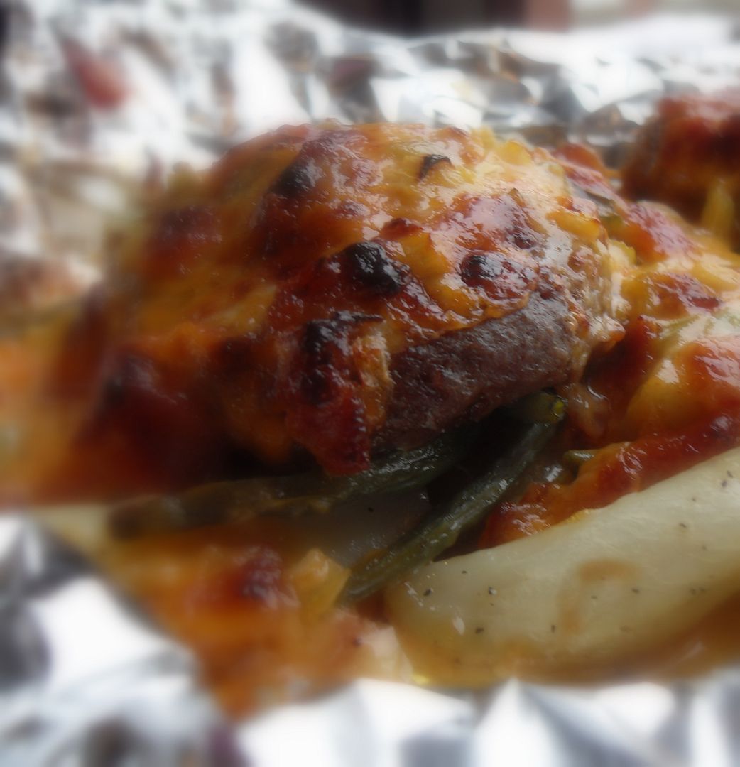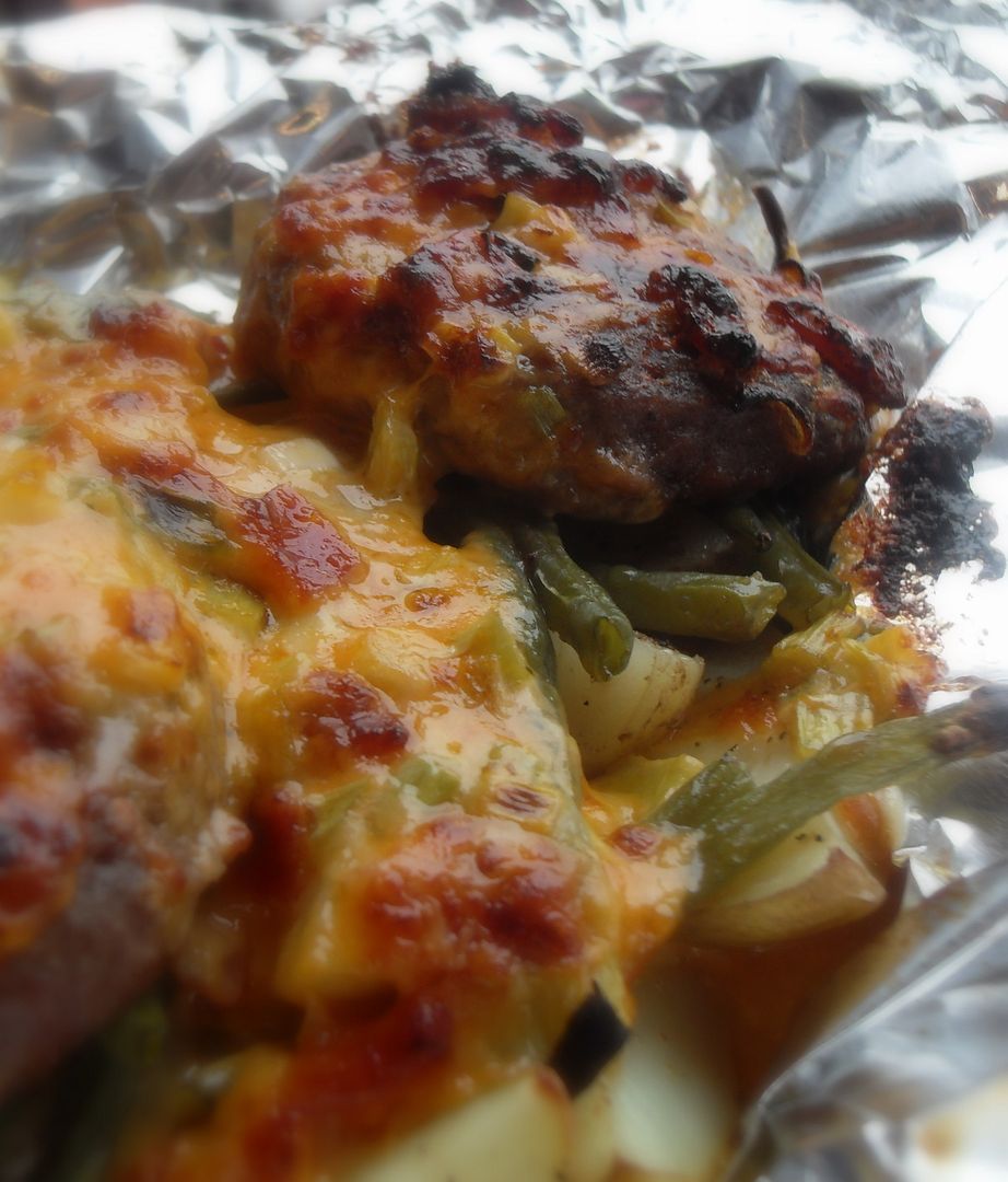 Delicious foil packets filled with potatoes, beans and burgers, with a tasty cheesy topping added at the last minute, and cooked until meltingly scrummy!