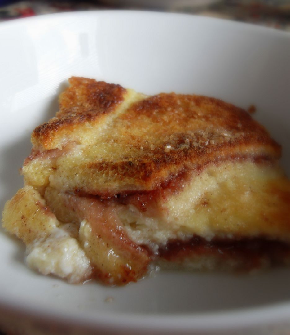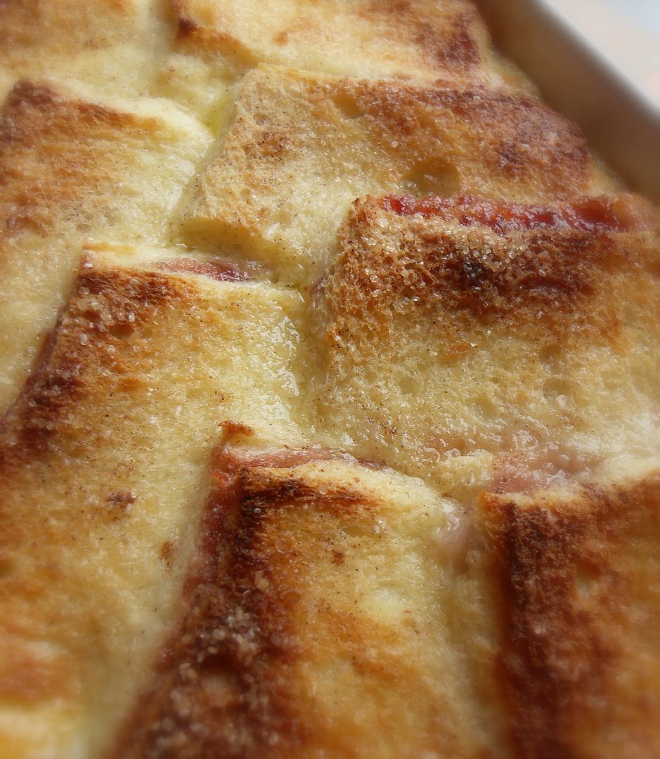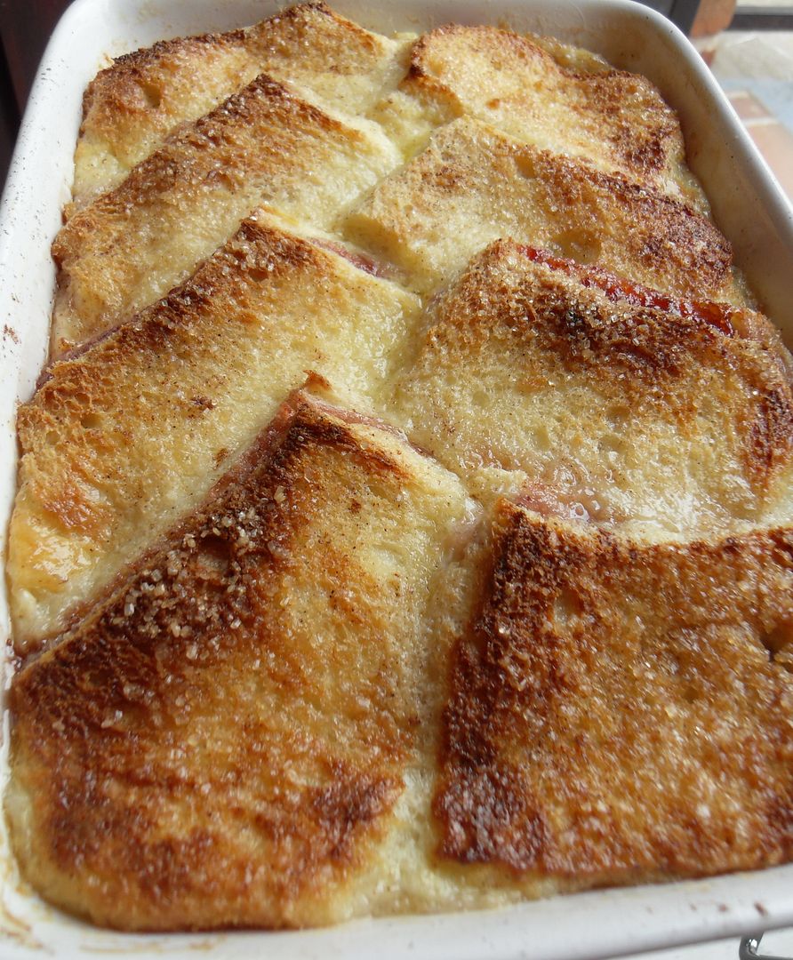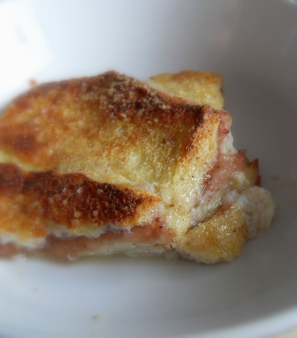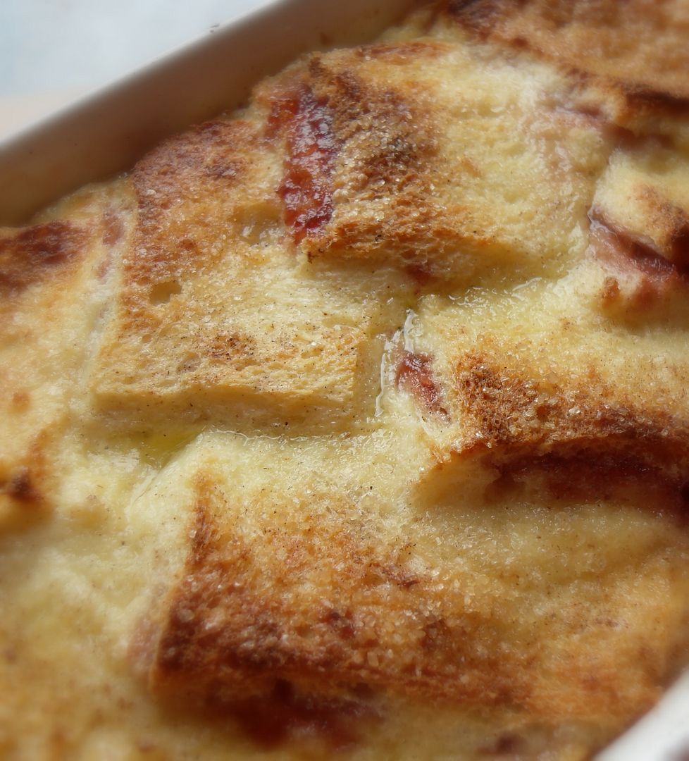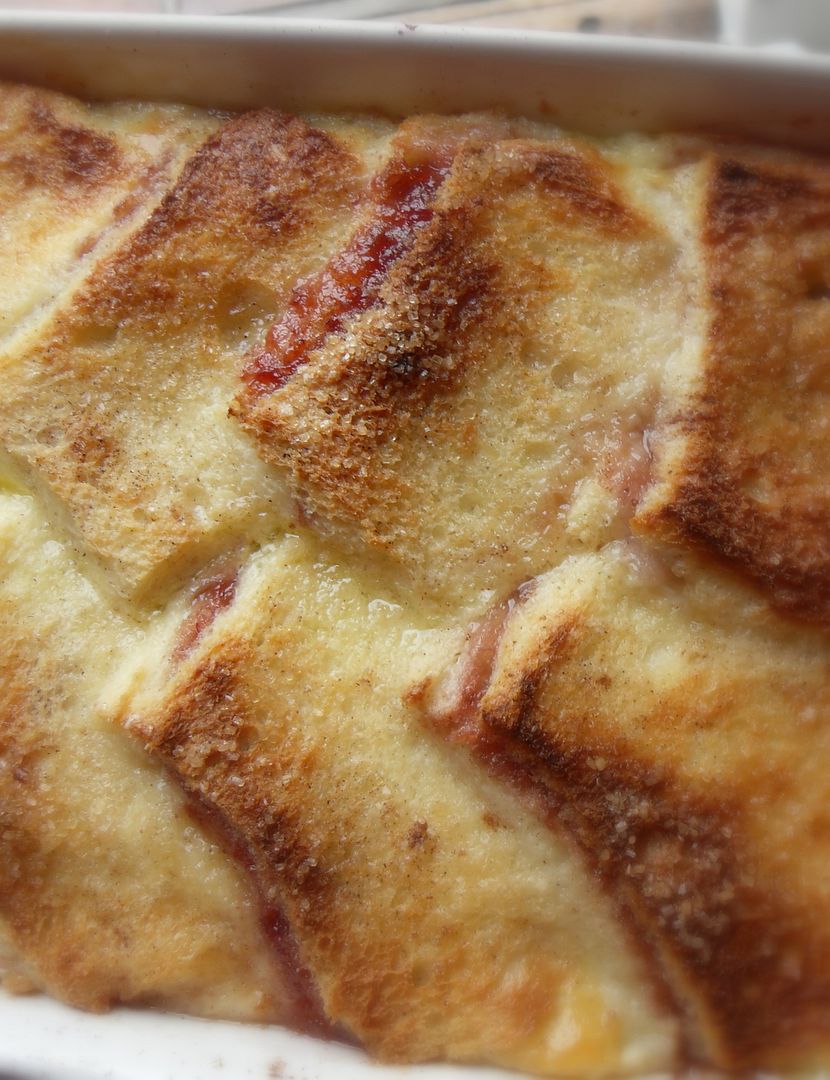 Like your traditional bread and butter pudding. I got to thinking the other day how delicious it would be with a layer of strawberry jam added in the middle . . . kind of like souffled jam sandwiches . . .