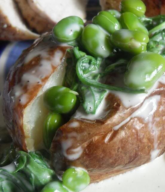 Imagine a tasty baked potato, it's skin all crispy and split open . . . topped with a delicious blue cheese sauce stogged full of fresh broad beans and tasty rocket. This is wonderfully delicious!