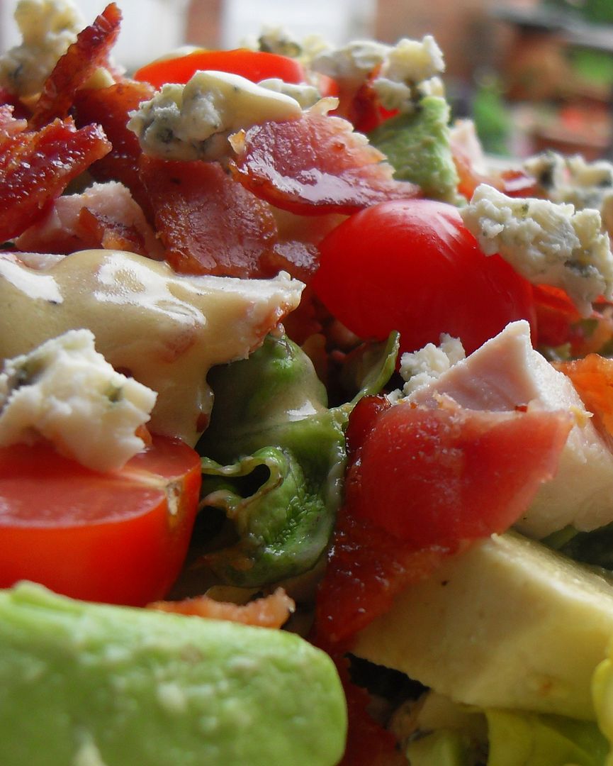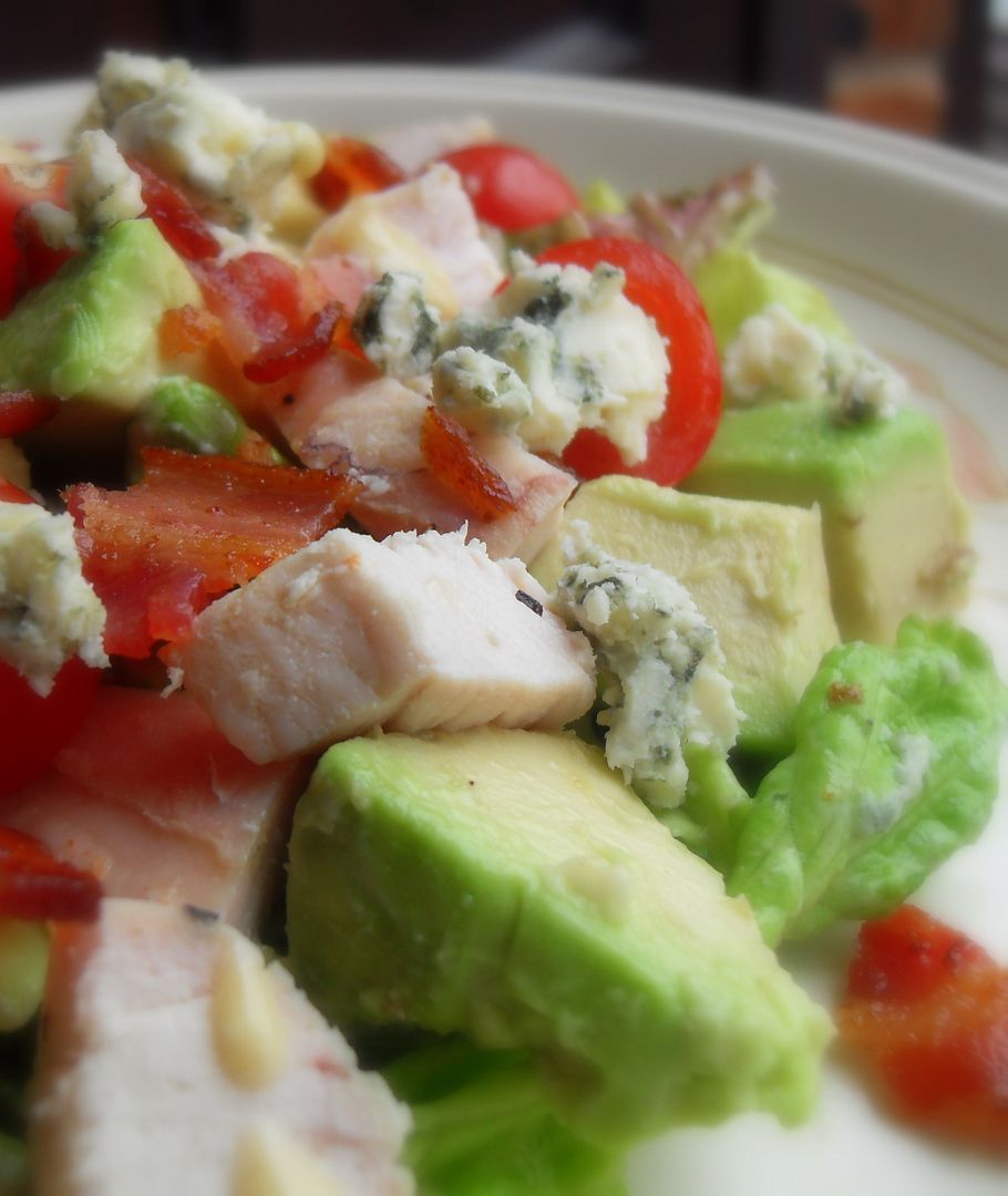 This salad is chock filled with super foods! It has turkey, avocados, tomatoes and olive oil in it. Sure, it also has blue cheese and bacon, but hey!! I reckon the superfood quality of the other things kind of outweighs any bad.
