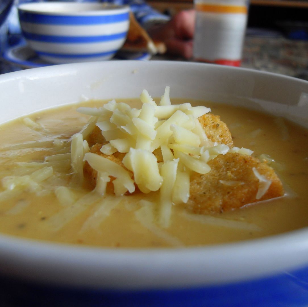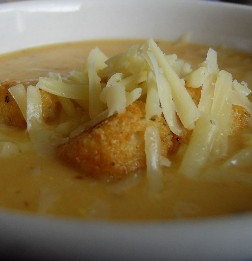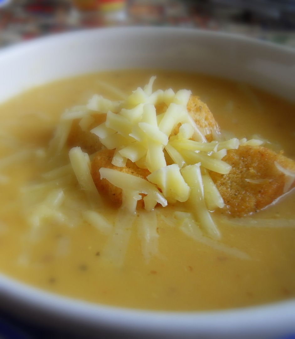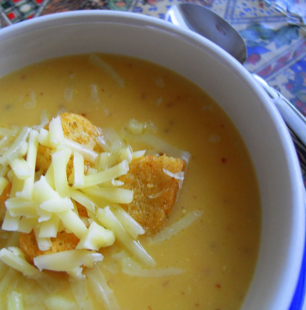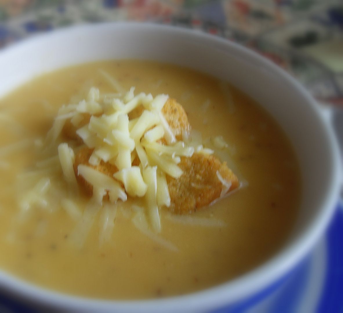 This is a delicious soup. You can easily make croutons by tossing bread cubes in oil and baking them for about 10 to 12 minutes in a hot oven, until crisp, topping with some cheese halfway through the baking time. Scrummy yummy!