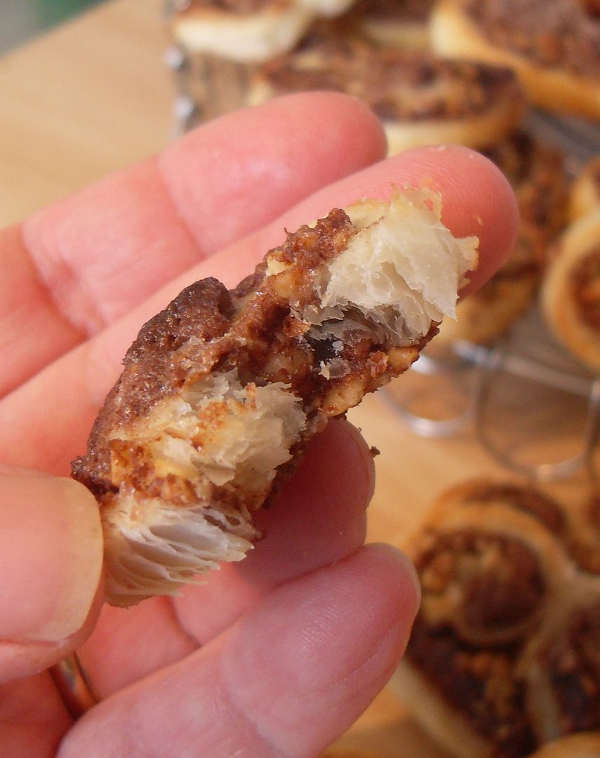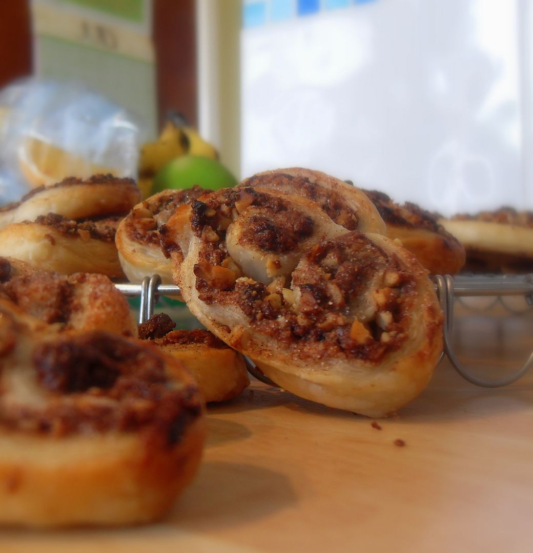 Imagine puff pastry, spread to the edge with delicious chocolate spread, sprinkled with toasted chopped hazelnuts, rolled up, sliced, sprinkled with cinnamon sugar and then baked until fabulously crunchy!!