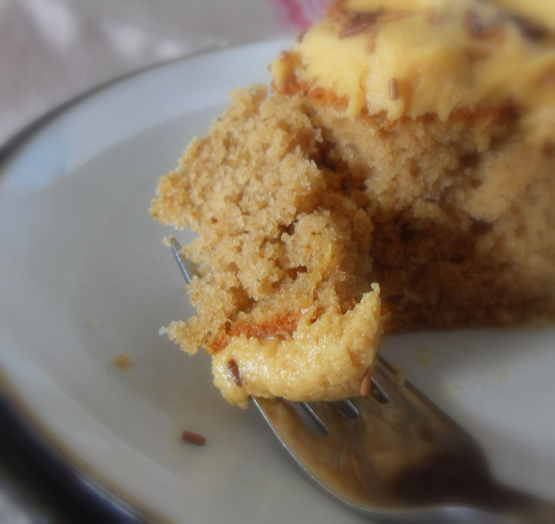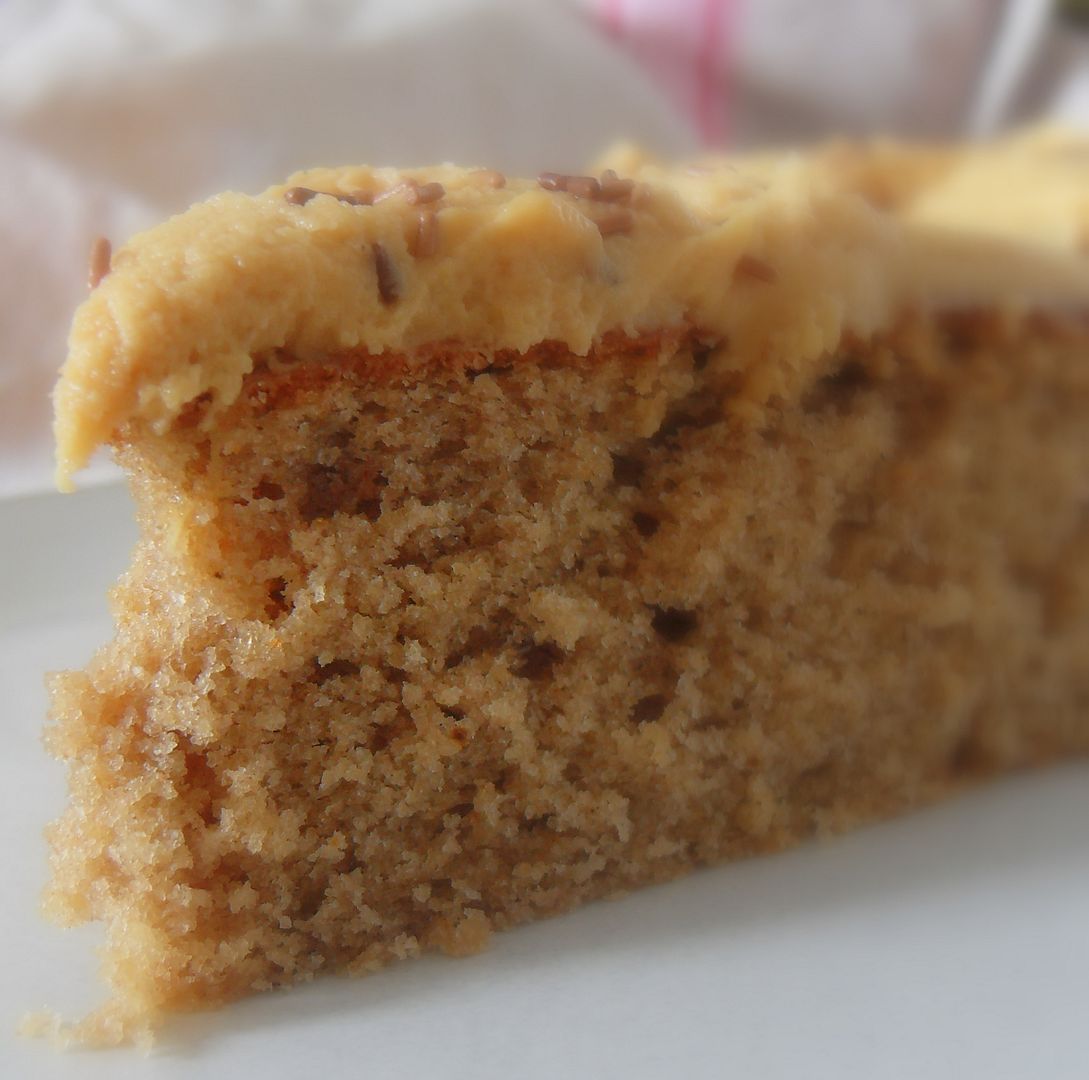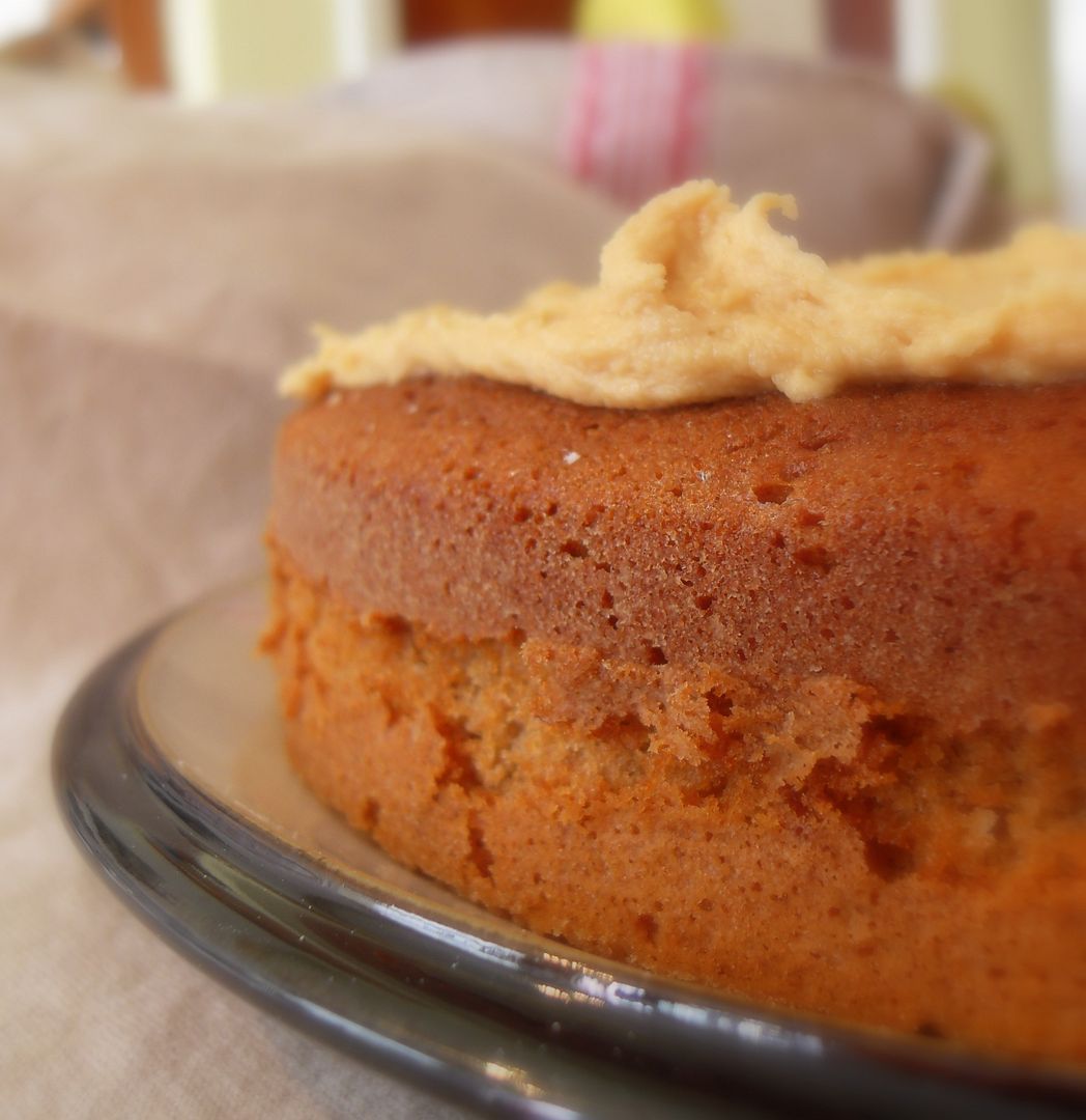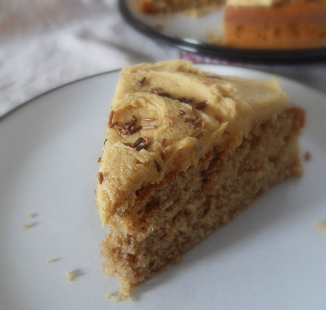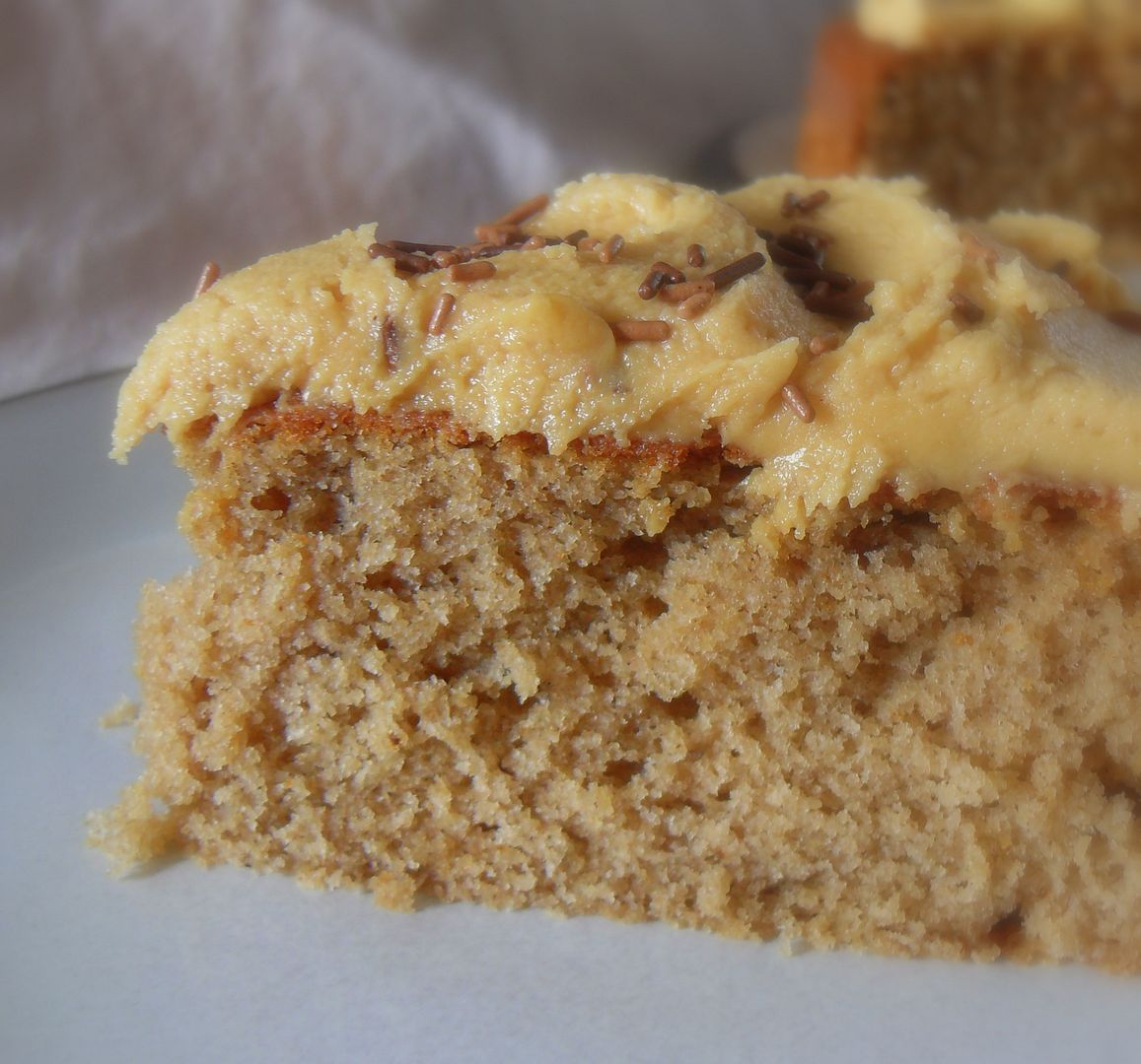 A velvety and tender cake, mildly spiced. Delicious! I have frosted it with a peanut butter flavoured buttercream frosting here, but you can use what you want. Maple would be very good as well.