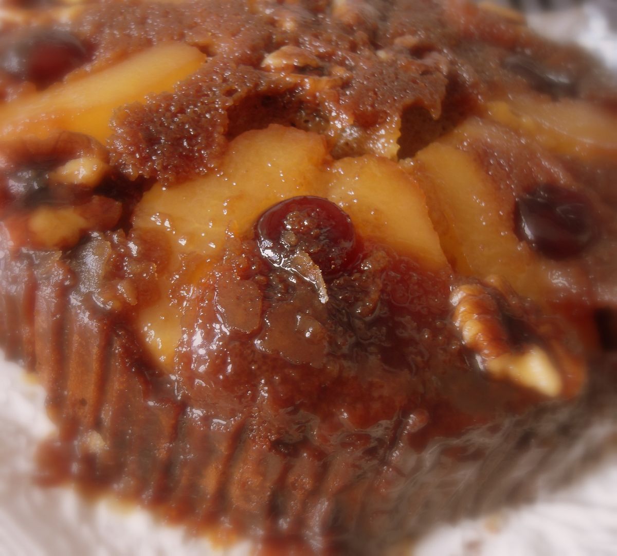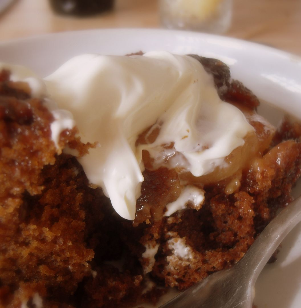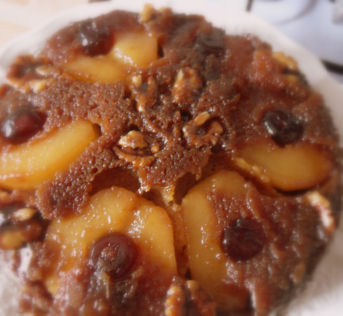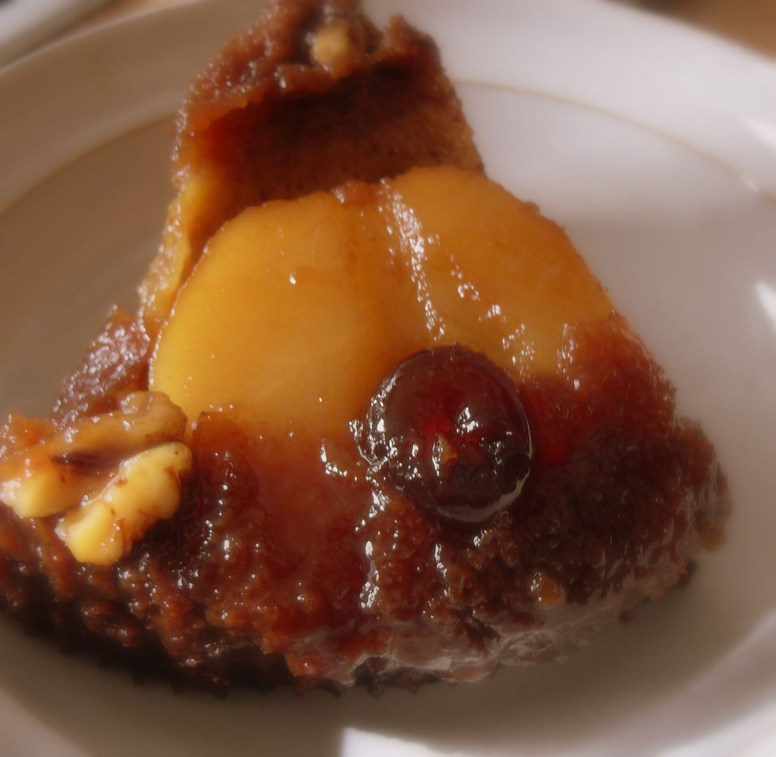 So perfectly autumnal . . . with fresh pears and warm spices . . . toasty walnuts, cherries and sweet sugar and treacle . . . both kinds golden and dark . . . the end result more like a cake than a pudding, with a rich toffee topping pooled around the fruit and nuts . . . the cake all rich and gingerbready beneath that fruity decadence.