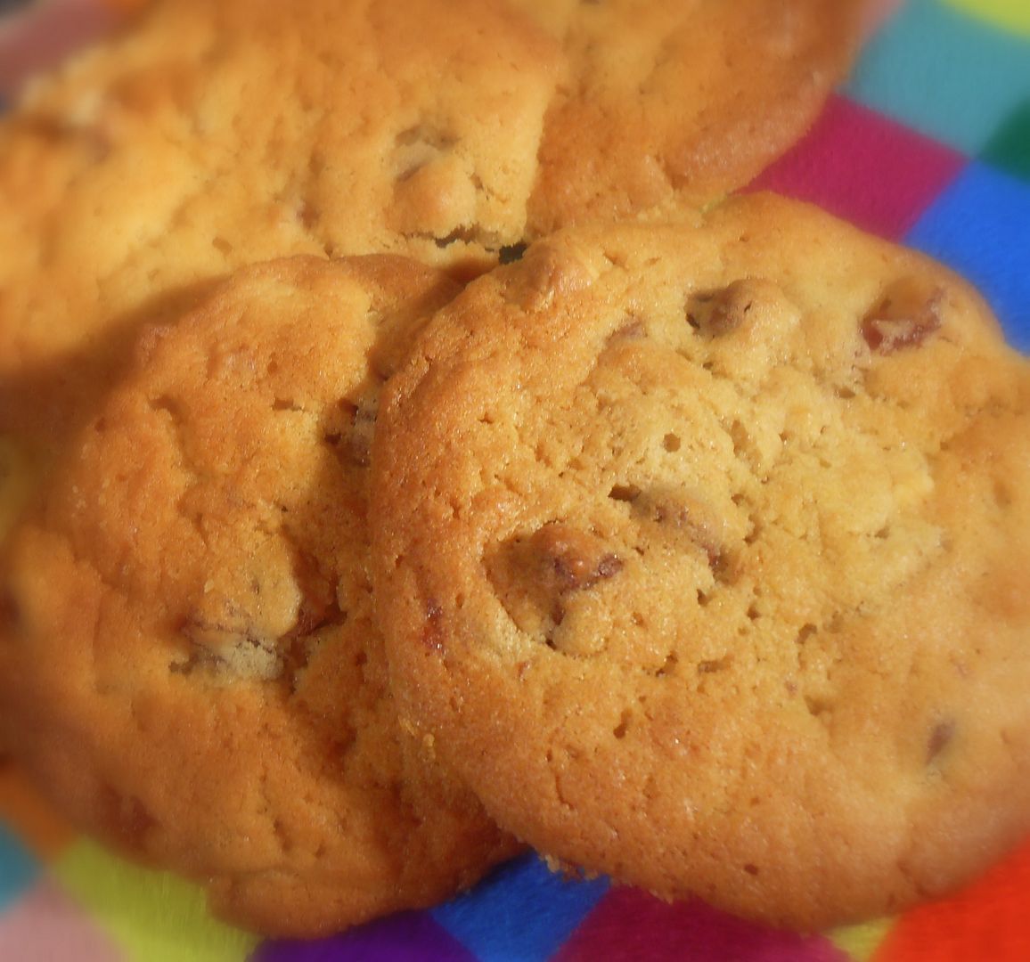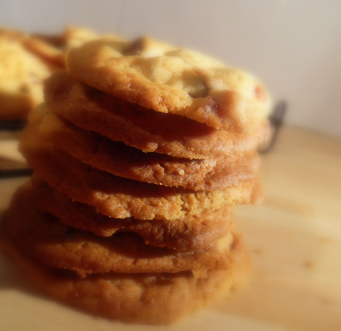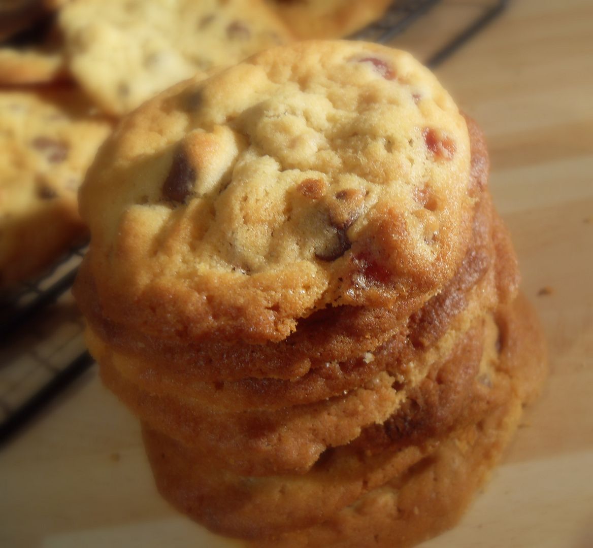 With crisp brown edges and chewy centres, they satisfy the crunch/chew factor perfectly! Chock full of bits of bittersweet dark creamy white chocolates, and sweet chunks of glace cherries, these cookies please on many levels.
