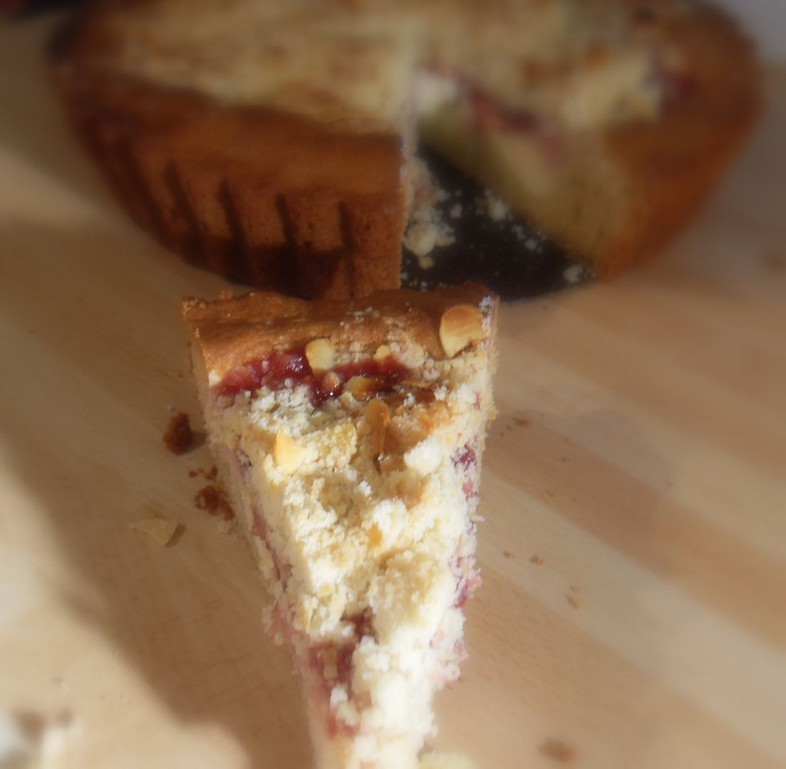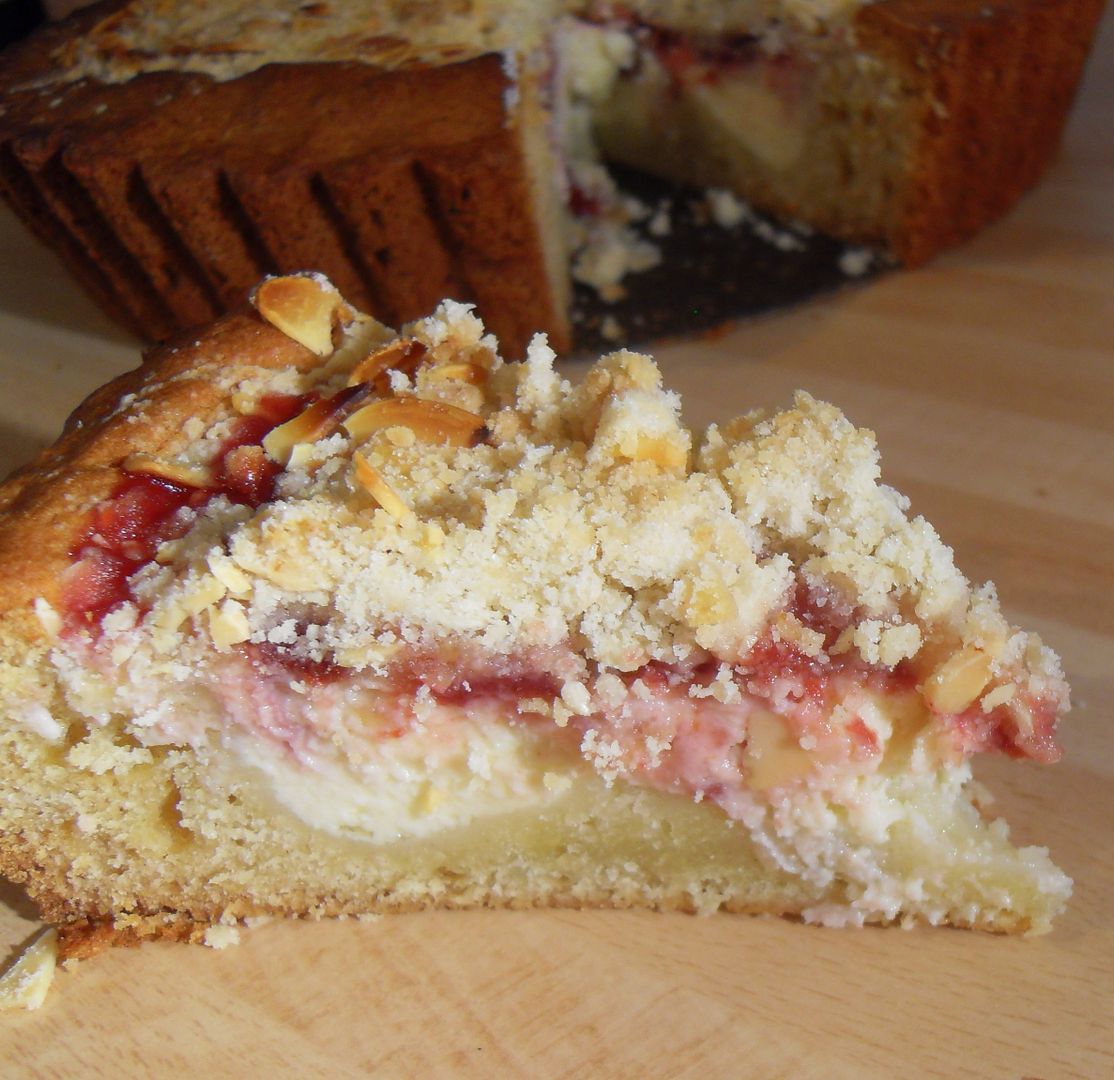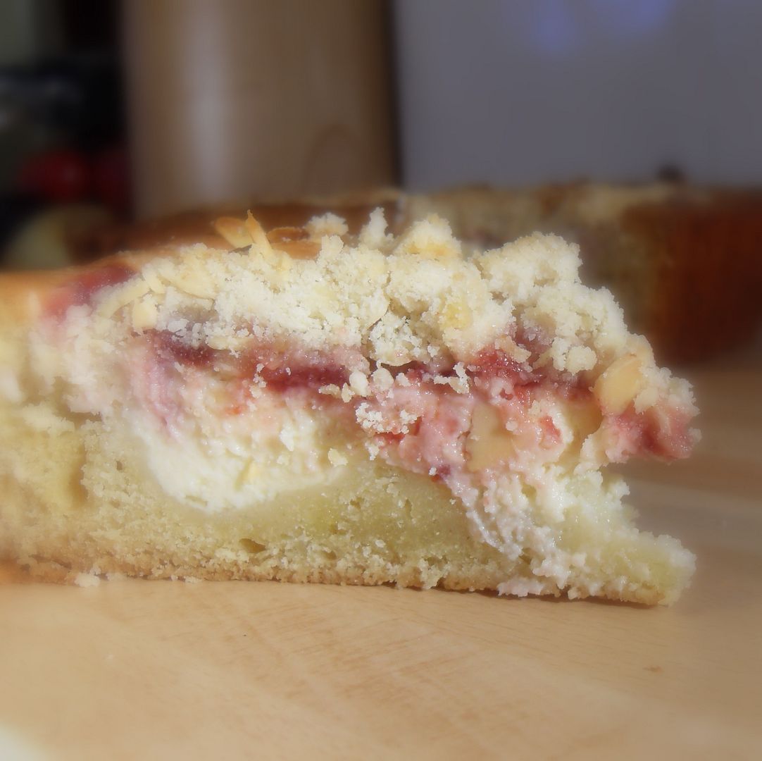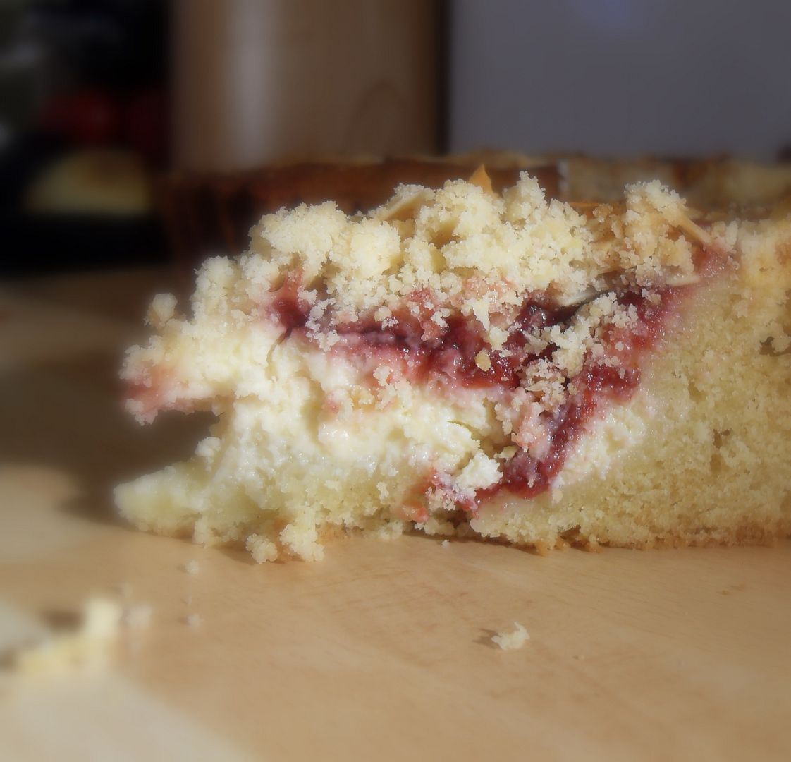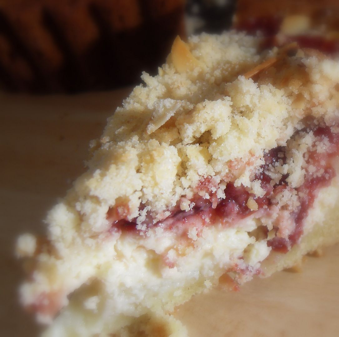 A lovely buttery cake with a cream cheese filling, topped with morello cherry jam, and a nutty streusel topping. Easy and delicious!!
