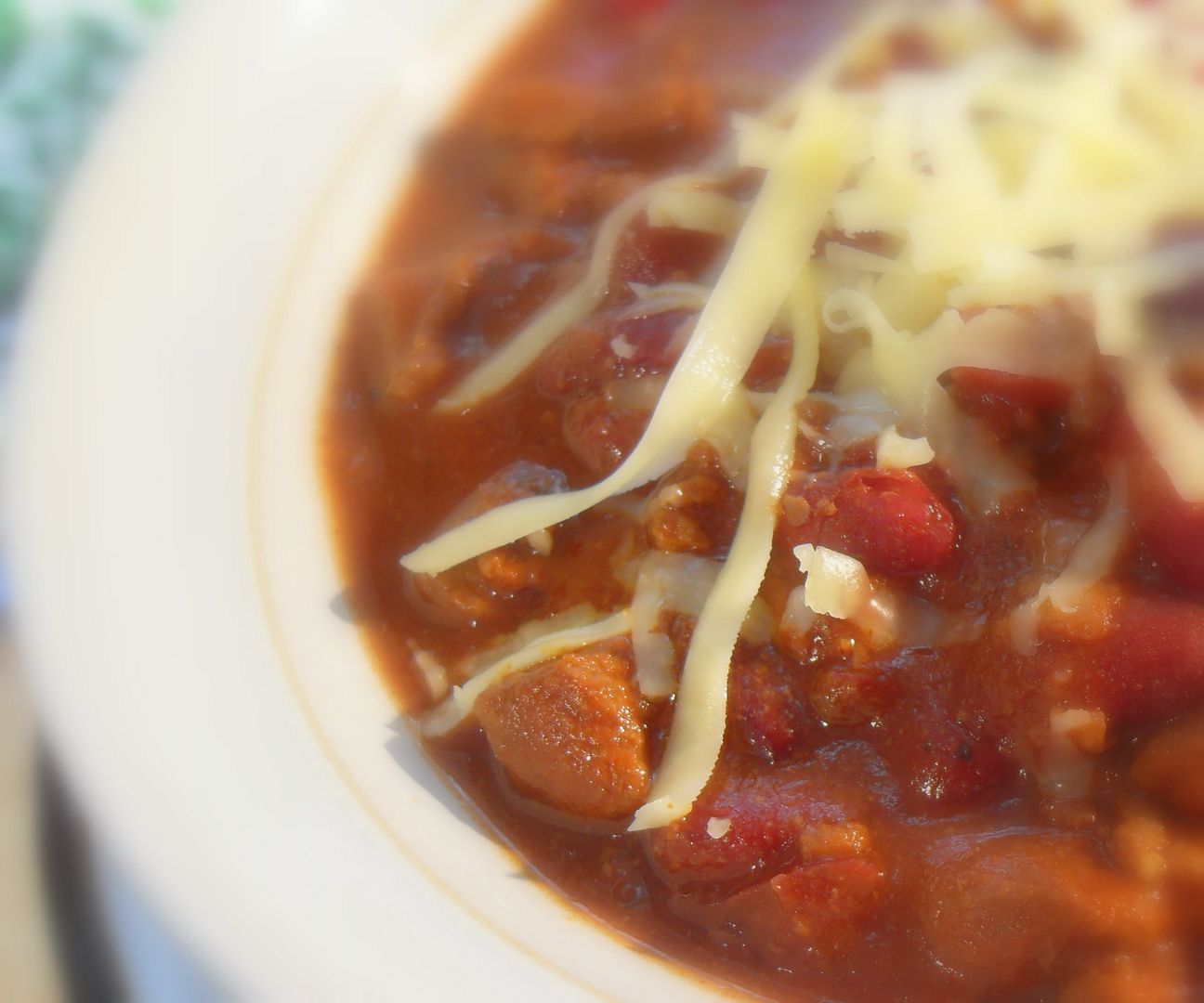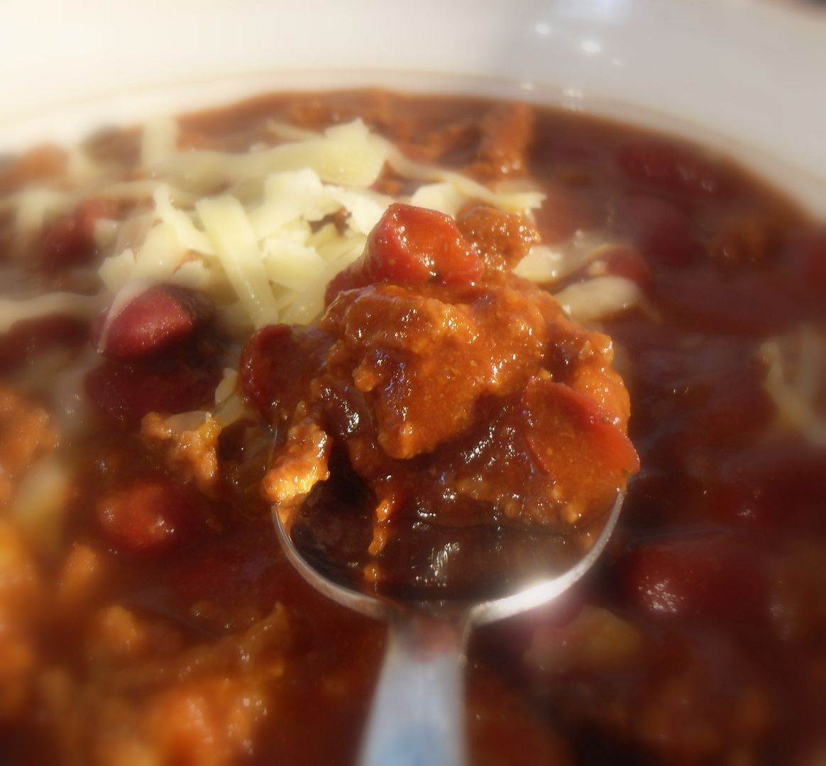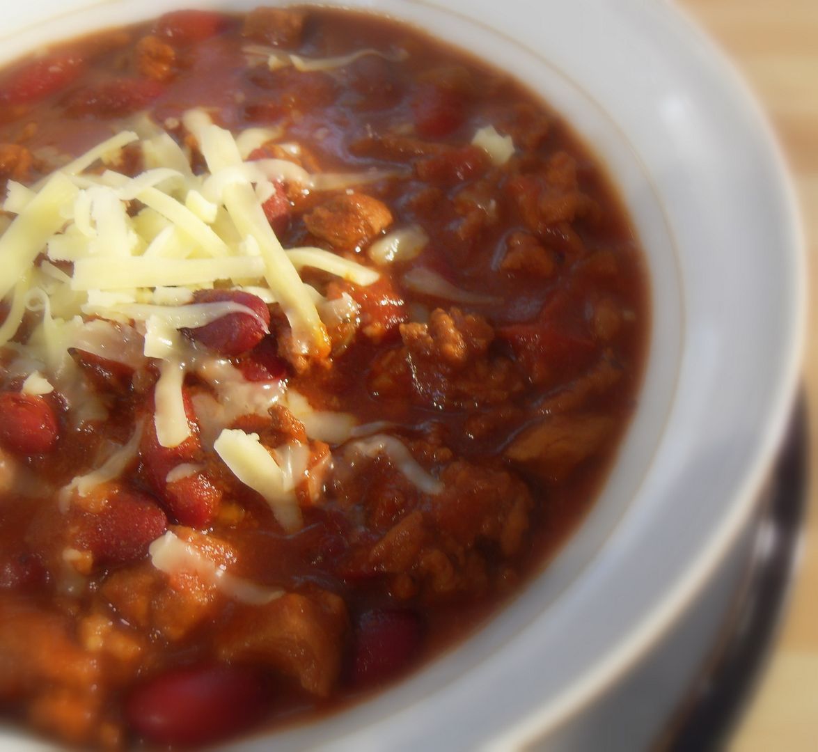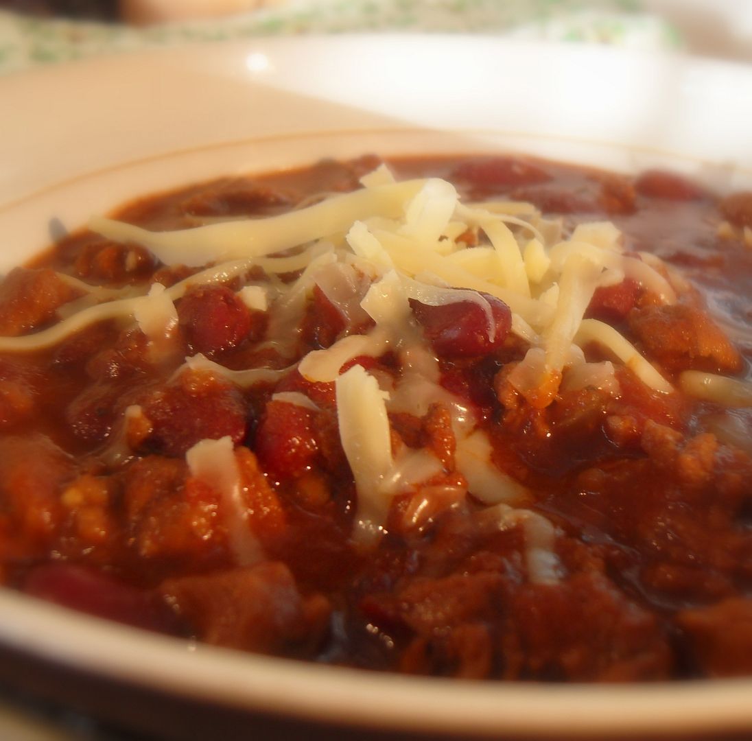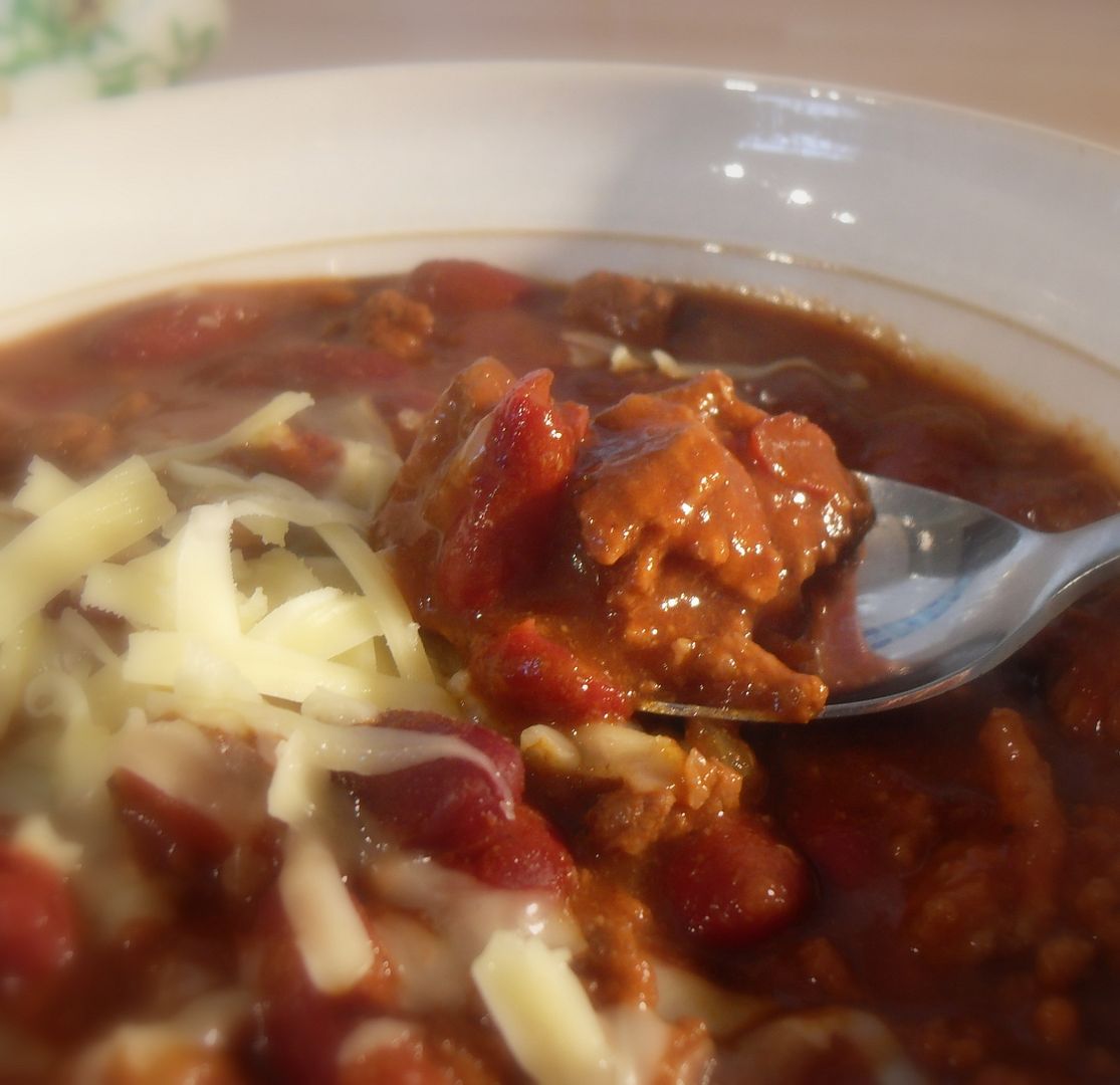 This is a fantastic bowl of red, or chili as it is commonly called. Rich and flavourful and oh sooooooo scrummy! We like it with grated cheddar cheese dusted over the top, and a bit of chopped onion . . .