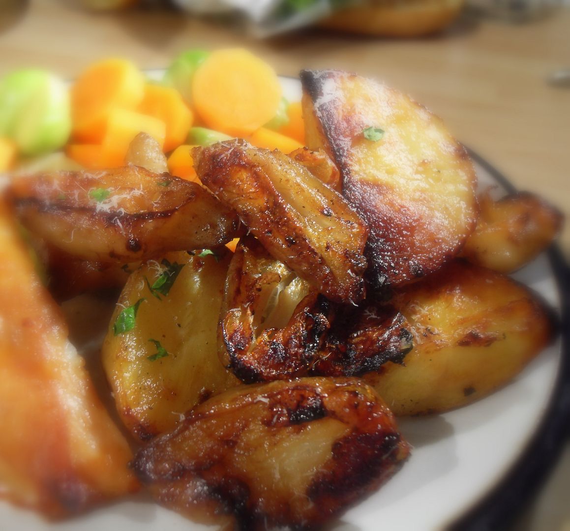 Scrub your vegetables really well, Do not peel, but cut in halves or quarters depending on their size. Place in the top half of a steamer and steam for about 10 minutes, until crispy tender. Place the tin of oil in the oven to get hot. Tip the steamed vegetables into the hot oil and give them a good shake to coat. Cut the lemons in half. Squeeze 3 halves over the vegetables and then dust generously with some sea salt and freshly ground black pepper. Pop into the oven and roast for about 35 minutes. Take them out and give them a good stir.