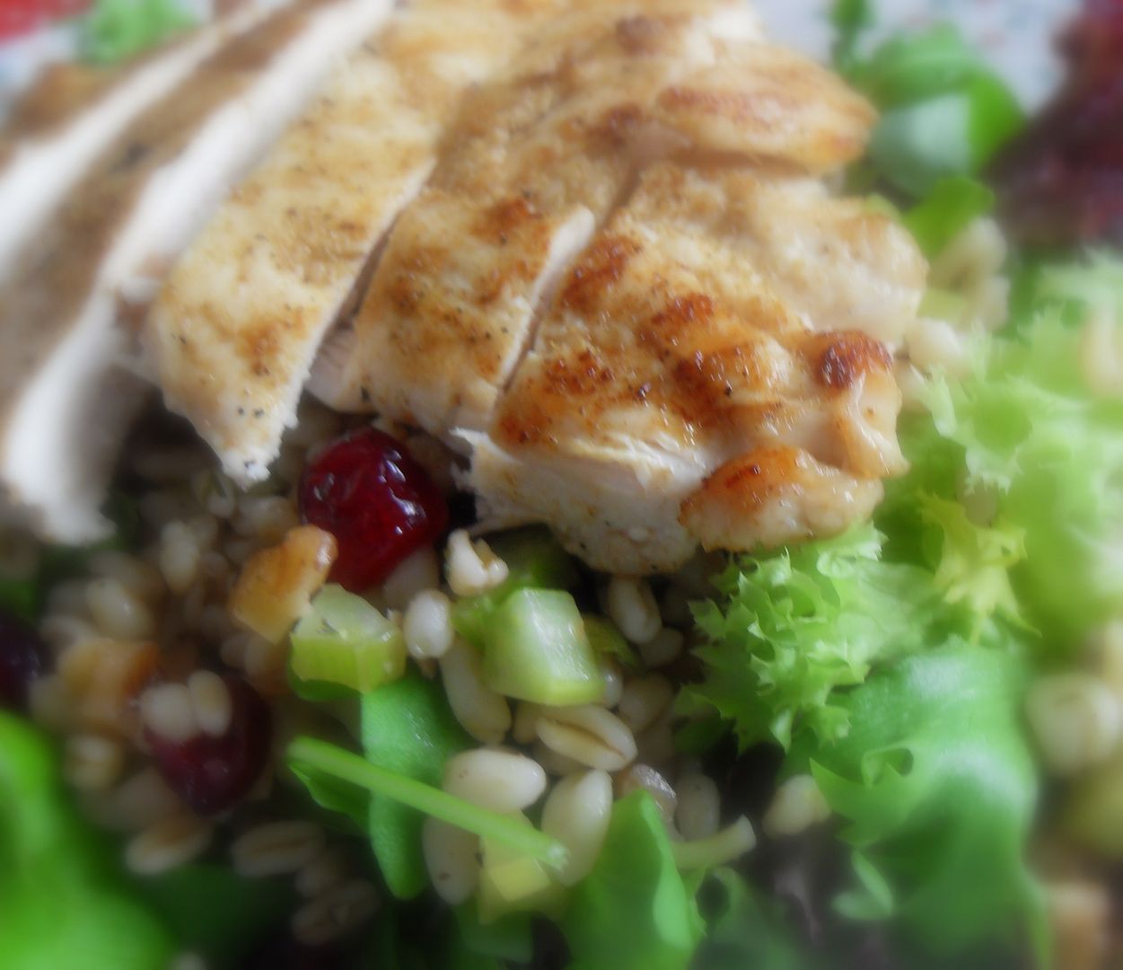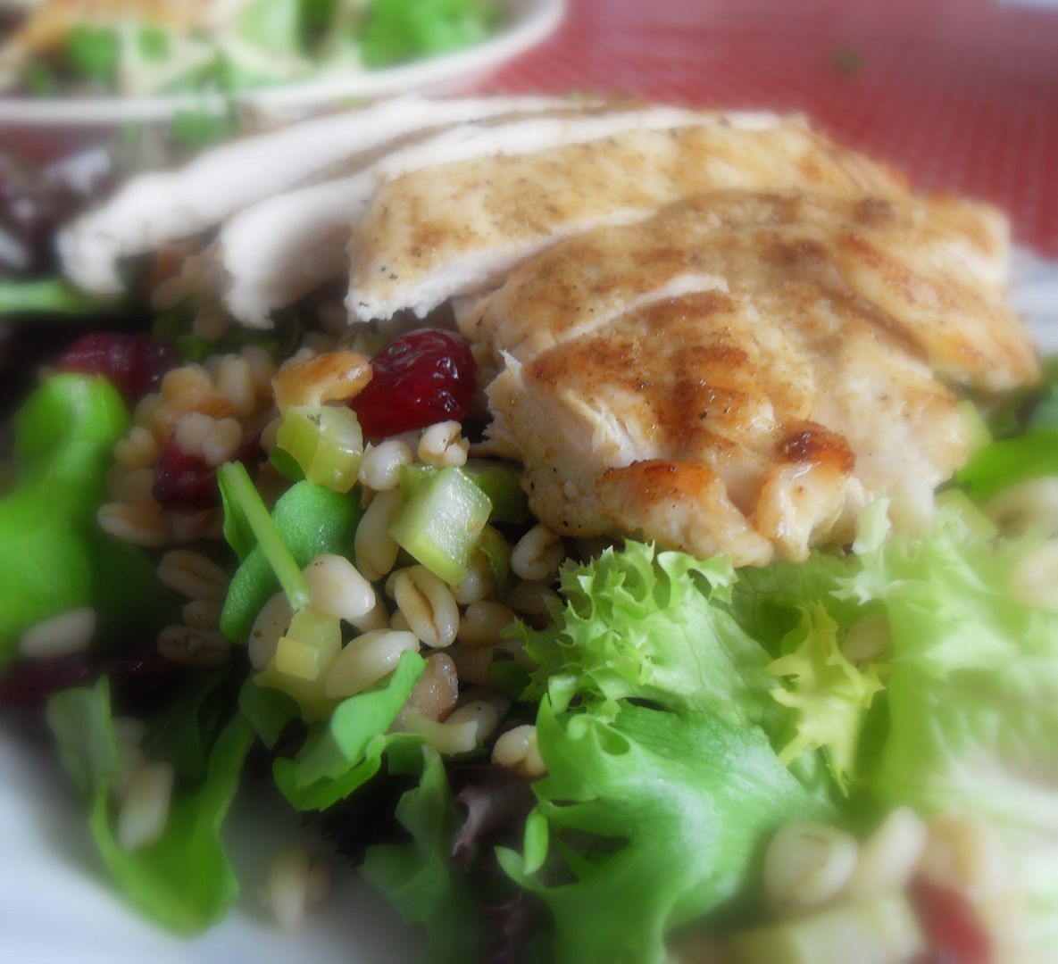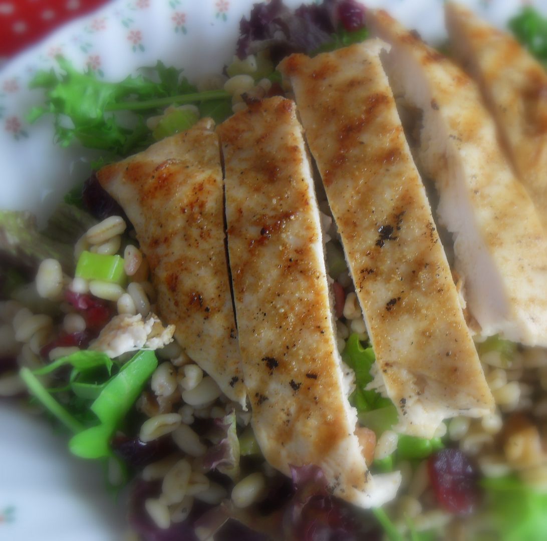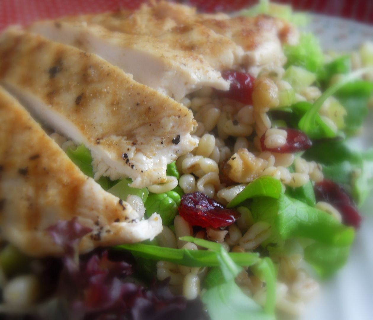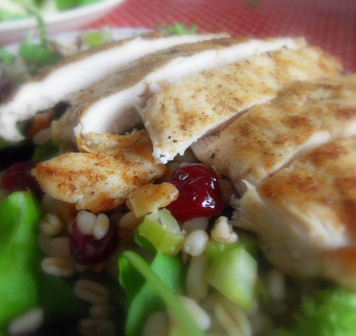 Hearty and deliciously different with a nutty and chewy wheatberries, sweet dried cranberries, crunchy toasted walnuts atop tender greens and topped off with a spicy grilled chicken breast!