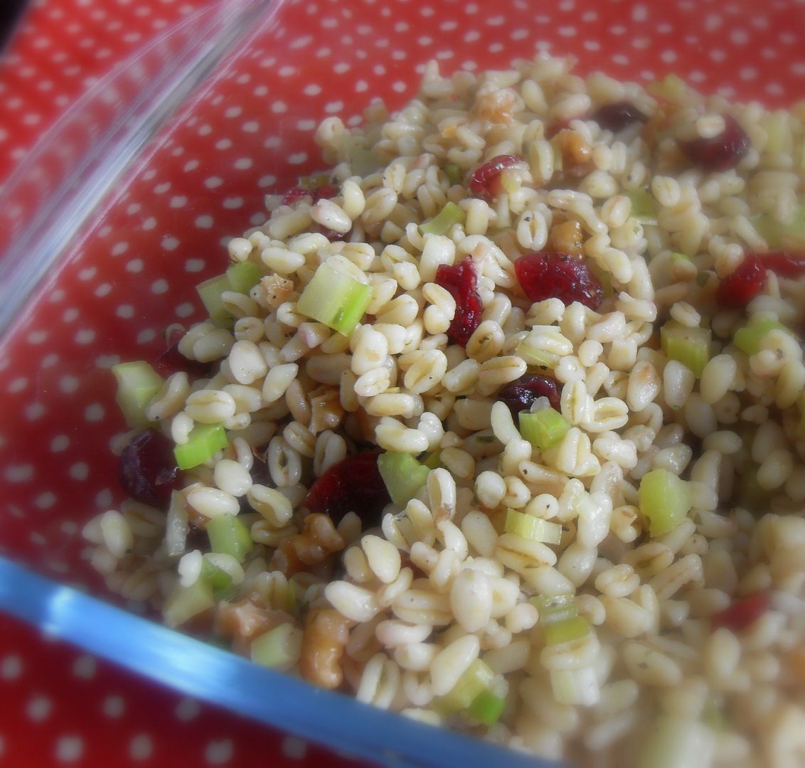Topping the colourful plate of salad greens with a delicious wheatberry salad, chock full of crunch and sweetness. Crunchy toasted walnuts and chopped celery . . . sweet dried cranberries . . . spicy spring onions, and a tangy lemon and olive oil dressing.