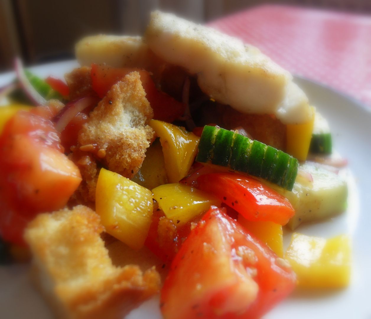 Like this delicious Gazpacho Salad. Fresh cucumber, tomatoes, peppers, red onions and garlic in a tangy sherry vinegar and olive oil dressing, tossed together with home baked croutons . . . oh so scrummy, and quite healthy too. You don't need any special bread do this with. I just used a hunk of baguette we had leftover from when the missionaries were over for their tea the other day.