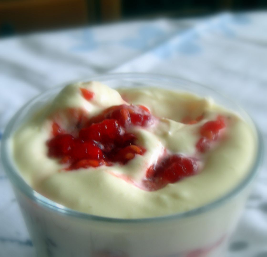 Mash the raspberries lightly with a fork. Gently stir them through the cream to cause a ripple, without over stirring. (You don't want your cream mixture turn pink.