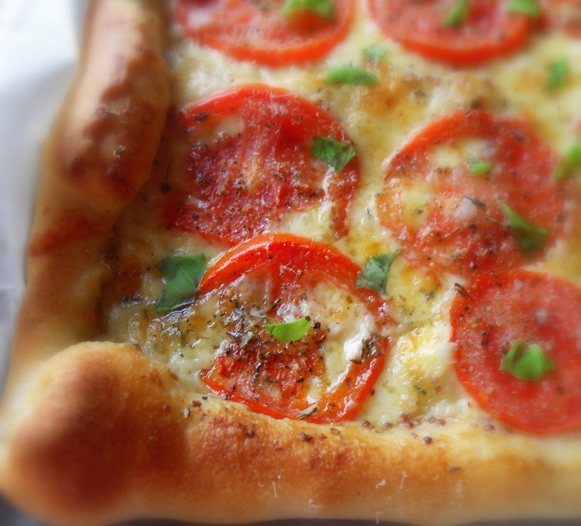 Stir together the mayonnaise and mustard. Spread this over the crust all the way to the rolled edges. Sprinkle the grated cheddar cheese evenly over top. Place the sliced tomatoes evenly over top. Dust with mixed herbs, seasalt and black pepper to taste. Sprinkle with some onion and garlic powder. Dust with freshly Grated Parmesan.