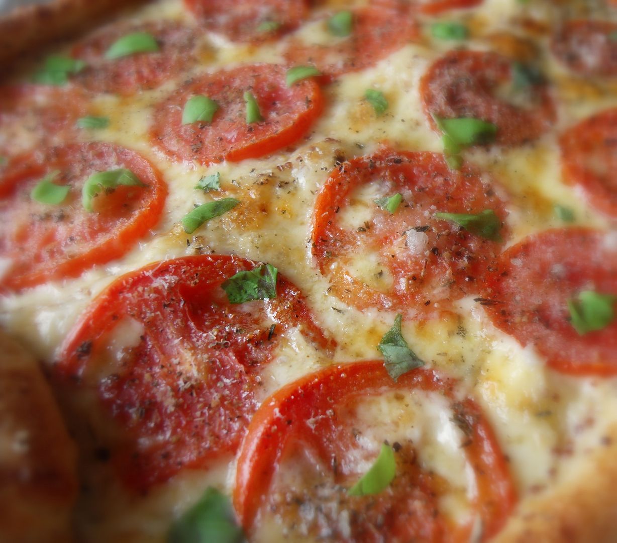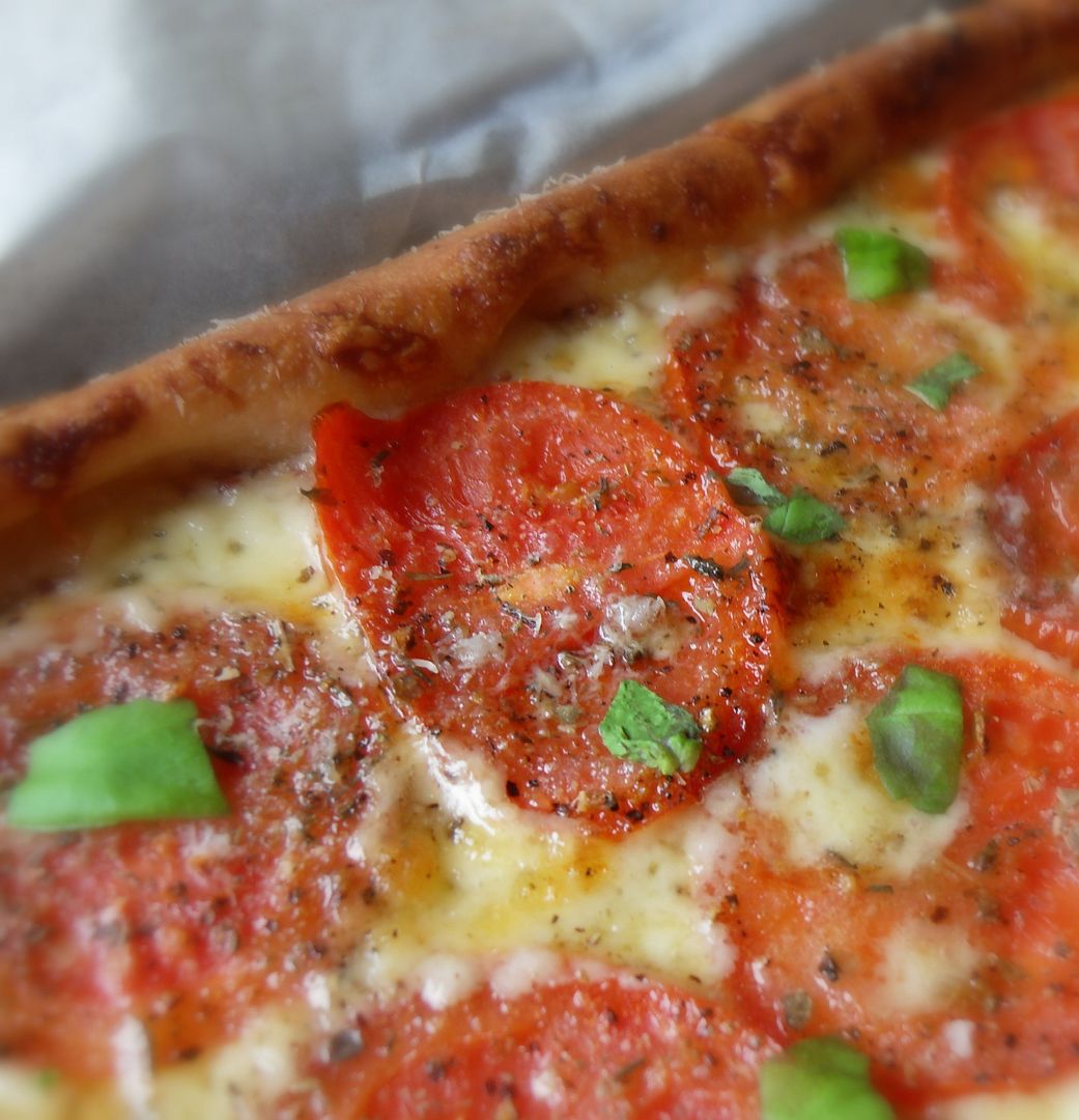 Bake for 15 to 20 minutes until lightly browned and bubbling and the bottom is browned evenly. Remove from the oven and allow to sit for several minutes before tearing basil leaves and scattering them over top. Cut into squares to serve. If desired, drizzle with some balsamic syrup.