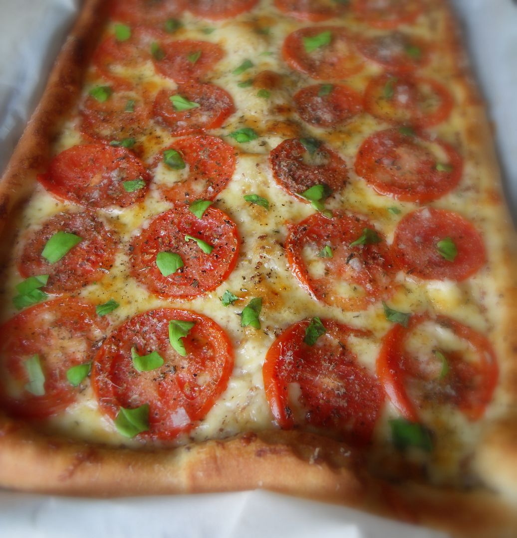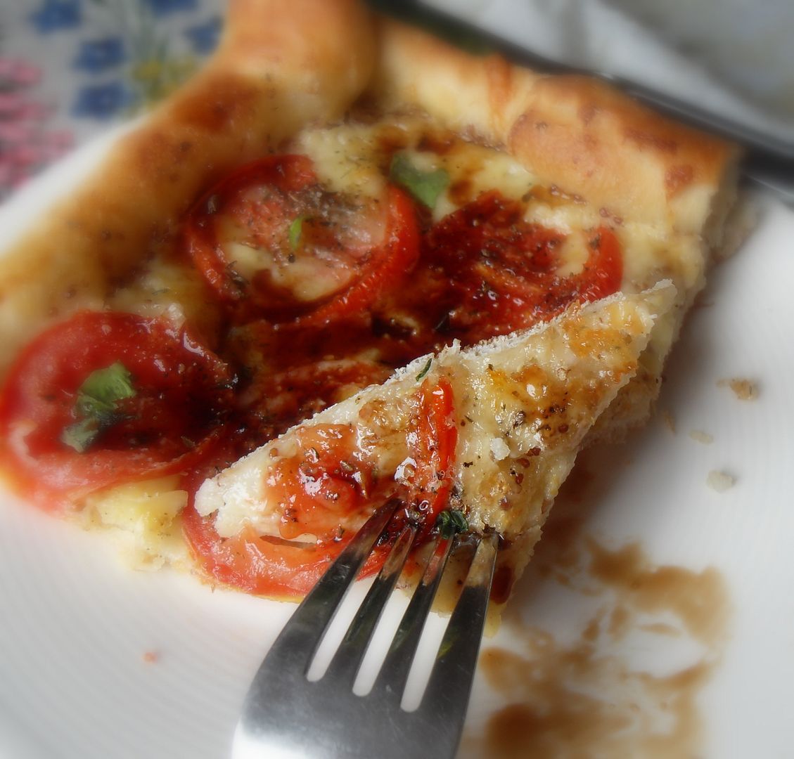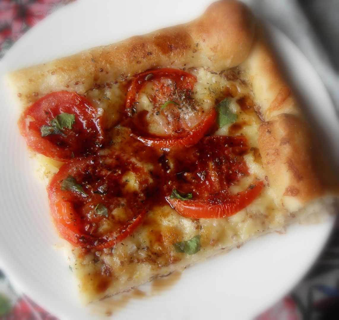 I normally would make a tomato tart using puff pastry, but I didn't have any in the fridge. I did however have a tube of pizza dough and so decided to use that instead. It turned out fabulously.