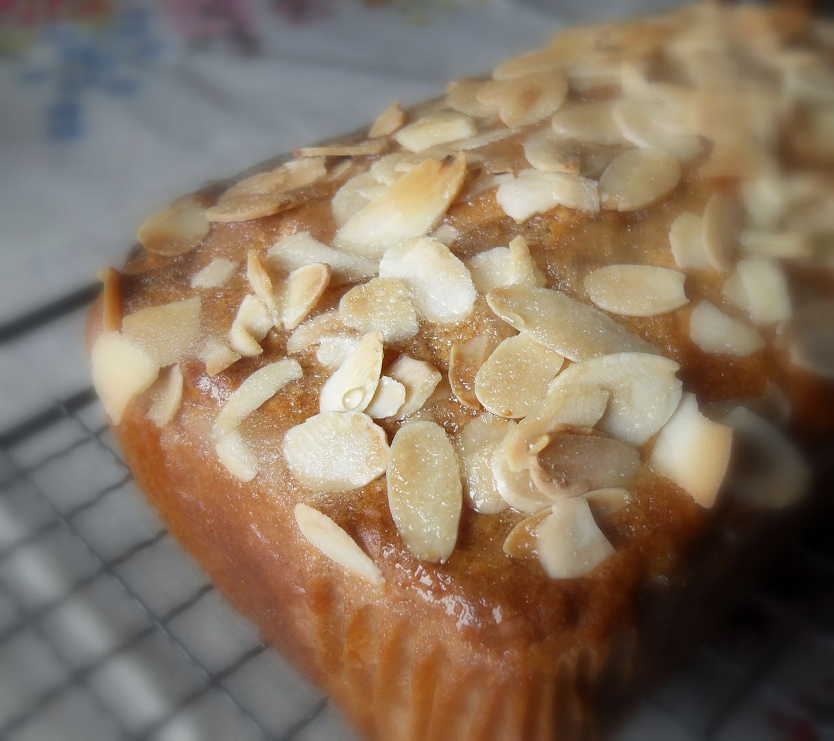Measure the oats and fruit into a large bowl. Add the warm milk. Allow to stand for about 10 minutes before proceeding. Sift the flour, cinnamon and baking powder together onto a piece of parchment paper. Stir the brown sugar, honey and beaten egg into the oat mixture. Stir in the flour mixture, mixing together well. Fold in 3 TBS of the almonds. Spread the batter into the lined tin, smoothing the top over. Sprinkle the remaining 2 TBS of flaked almonds on top.