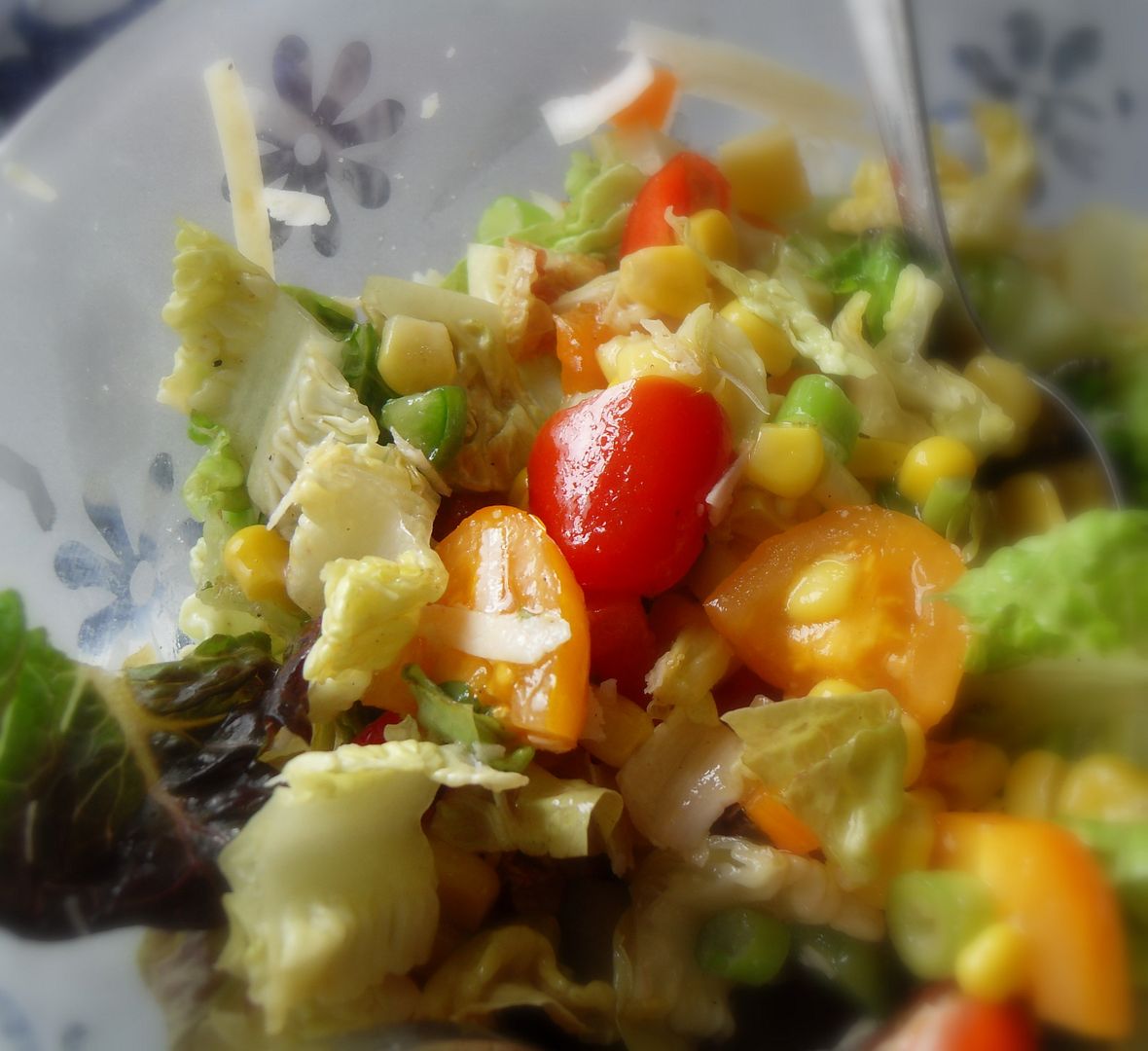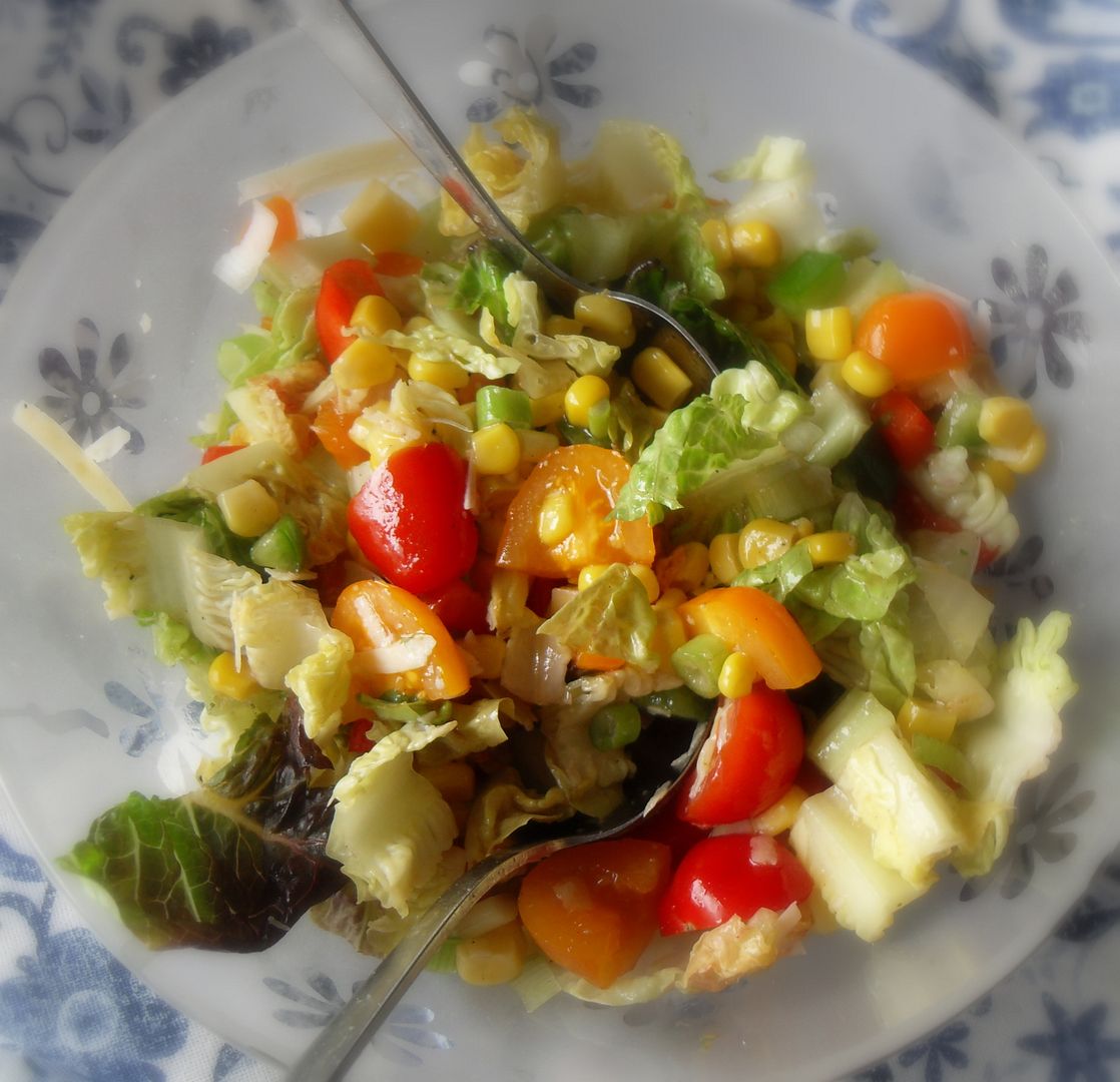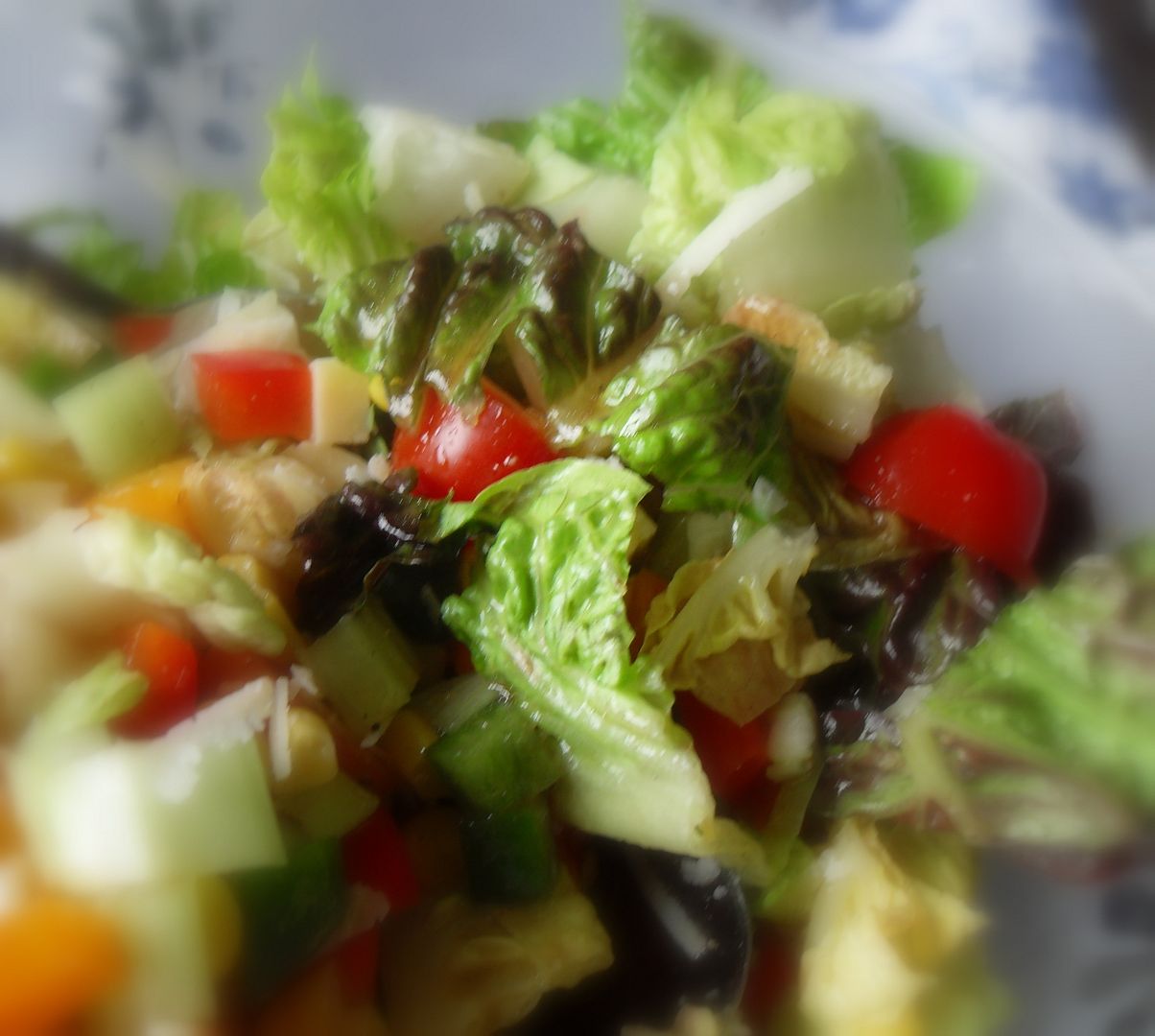 Healthy things like this delicious salad which I threw together the other night. I just used up things which I had in my veggie drawer that I thought would go together very well, according to colour and taste . . . and texture as well. That's very important.