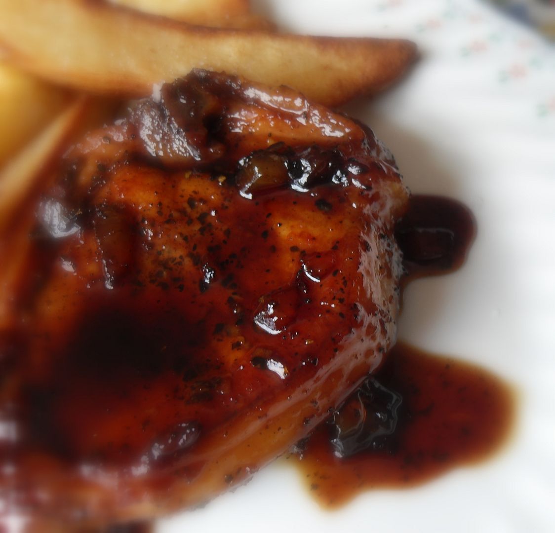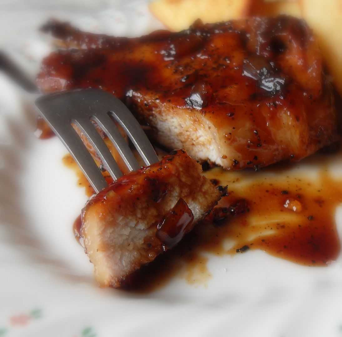 I am almost embarassed to call this a recipe. It's just something I came up with in my head. Tender, thick and juicy old fashione pork chops with the bone in . . . browned and braised in a fruity soy mixture, and then glazed until sticky and golden with some chunky Ginger Preserves.
