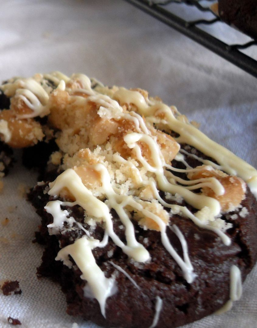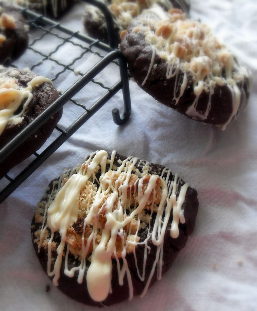 Deep, dark and delicious chocolate cookies, filled with chocolate chips, topped with a scrummy peanut topping and drizzled with white chocolate as a crowning touch.