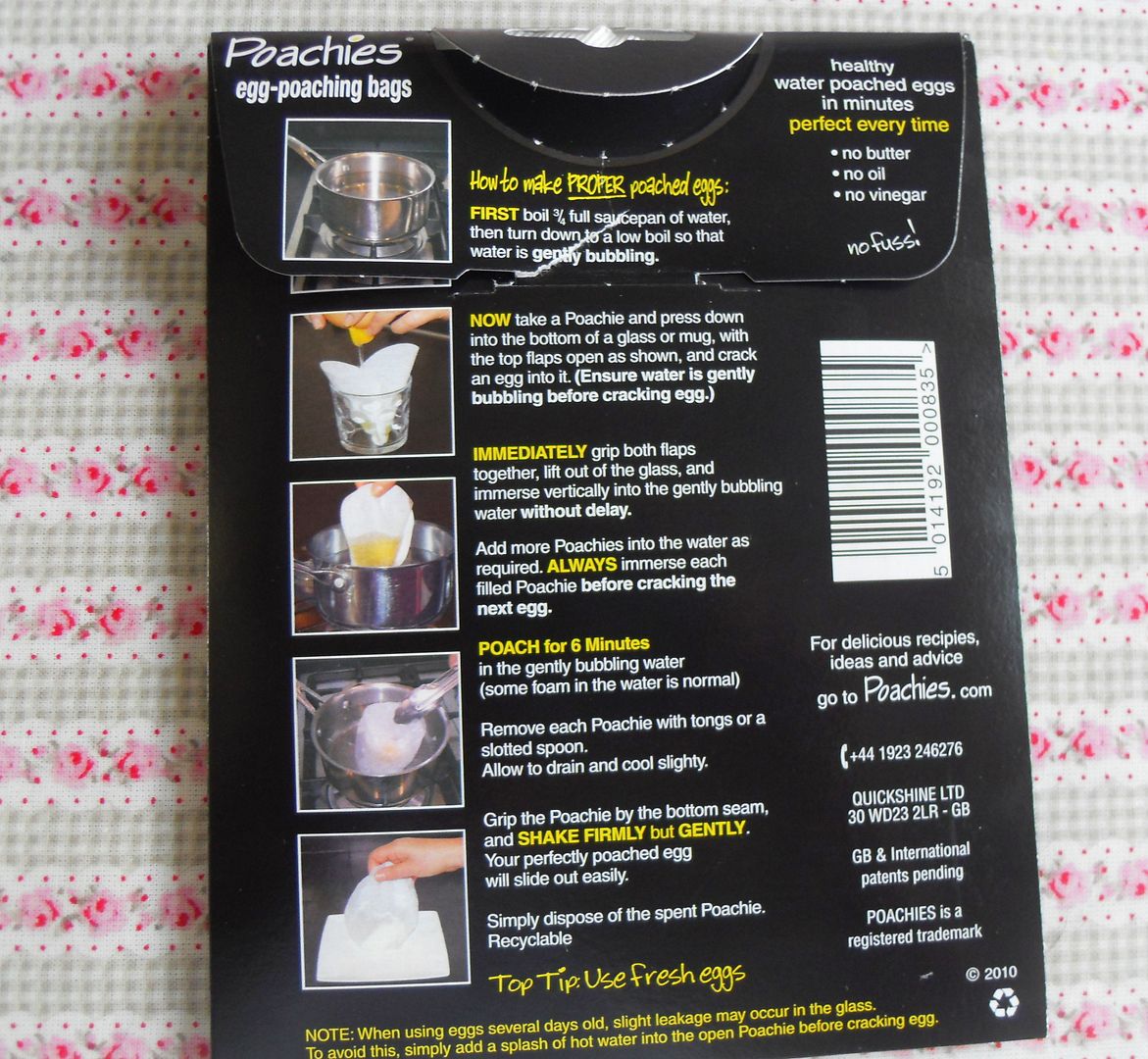 The package comes with fabulous instructions printed on the back. It's very hard to get it wrong if you follow them. I've tried them a few times now . . . and every time has resulted in perfectly poached eggs . . . with no hassle and no fuss!