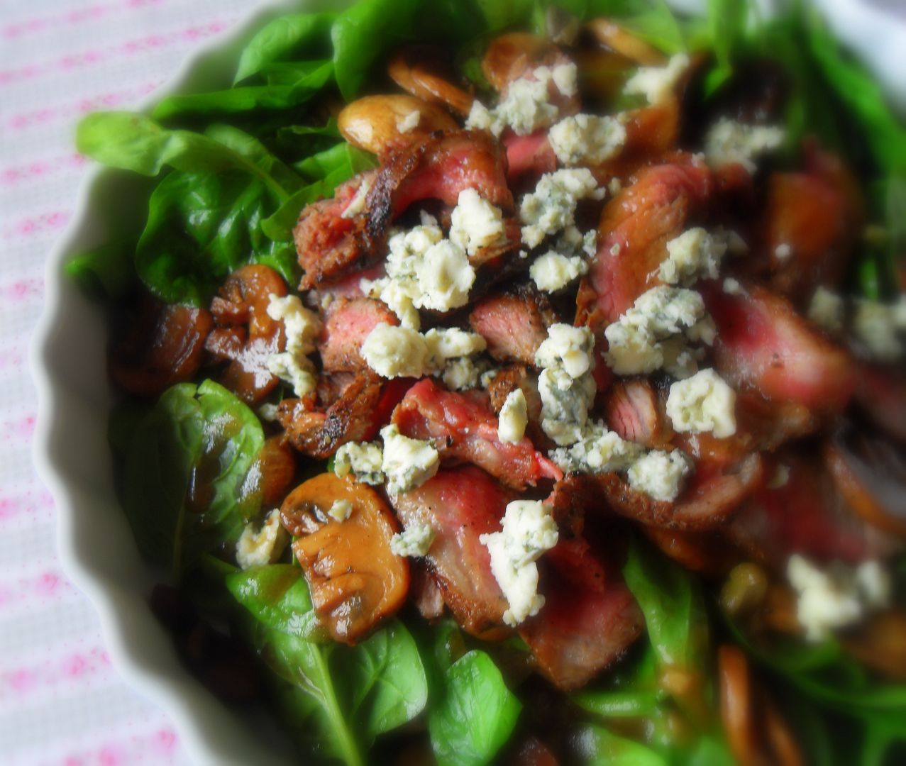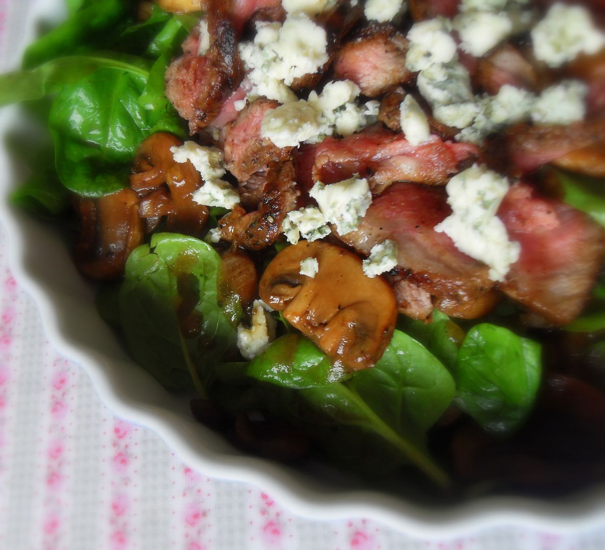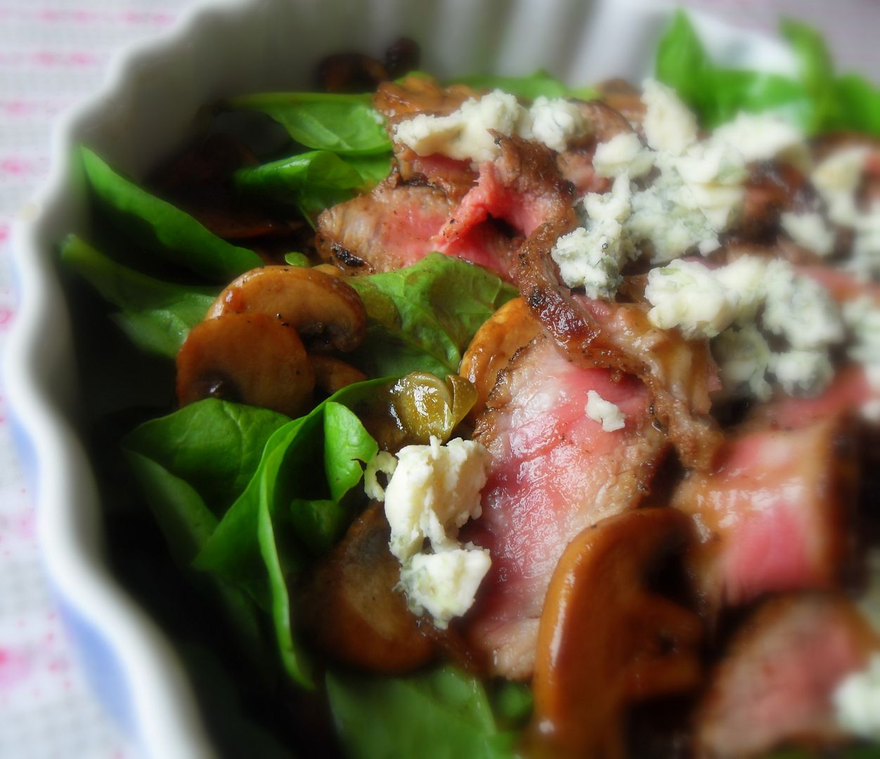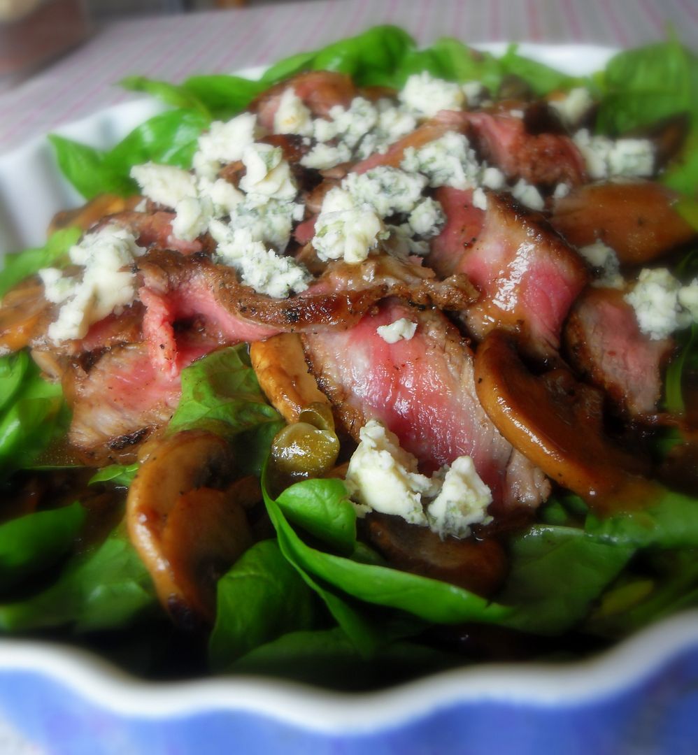 You get the green rich and meaty crunch of fresh baby spinach leaves . . . the lovely flavour of the steak, the tang of capers and blue cheese . . . rich mushrooms and a lovely vinaigrette, which when combined together create a fabulous salad that I would even serve to company.