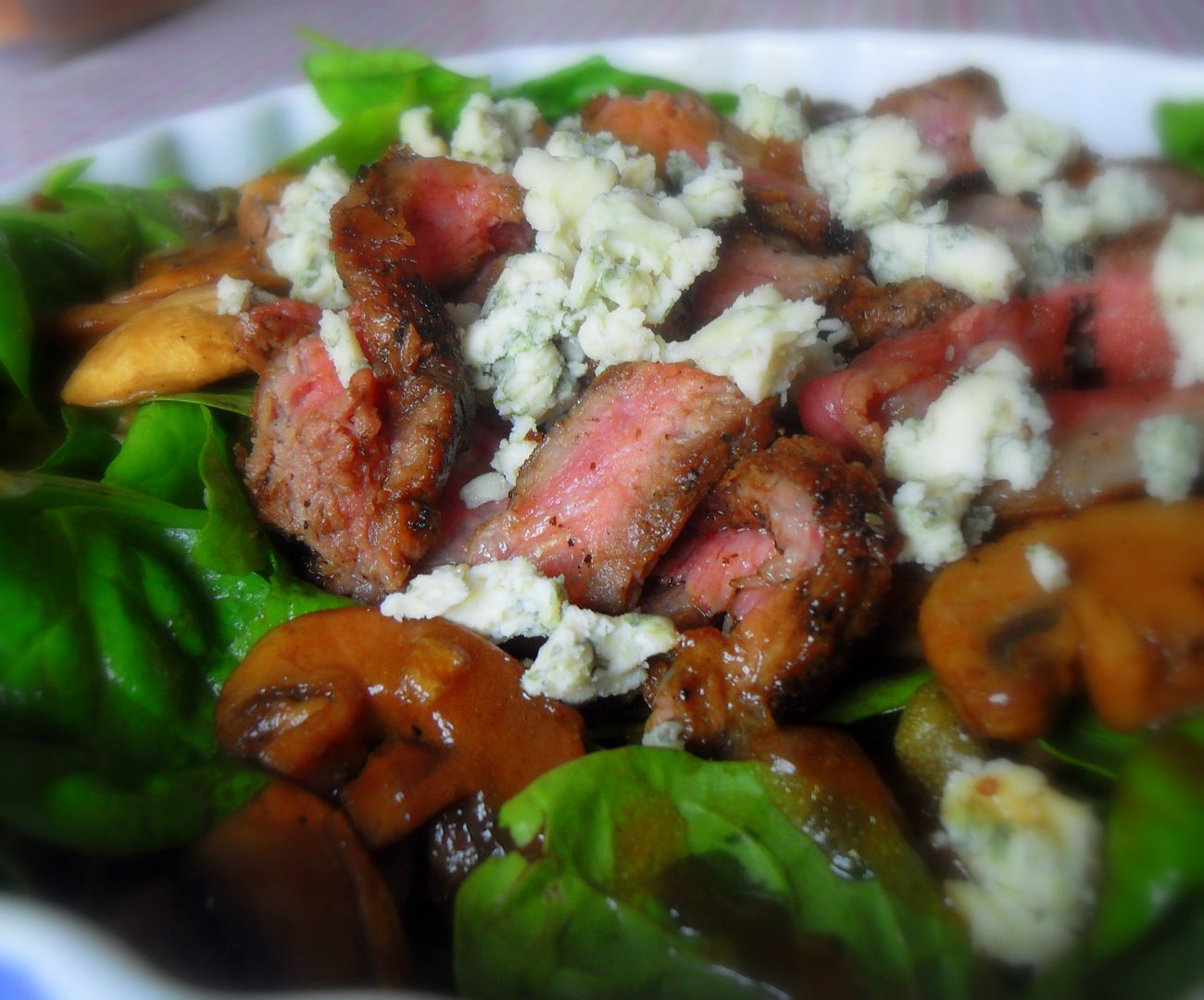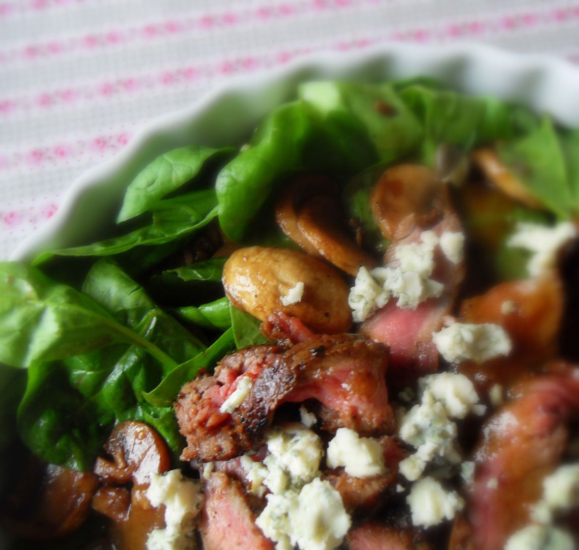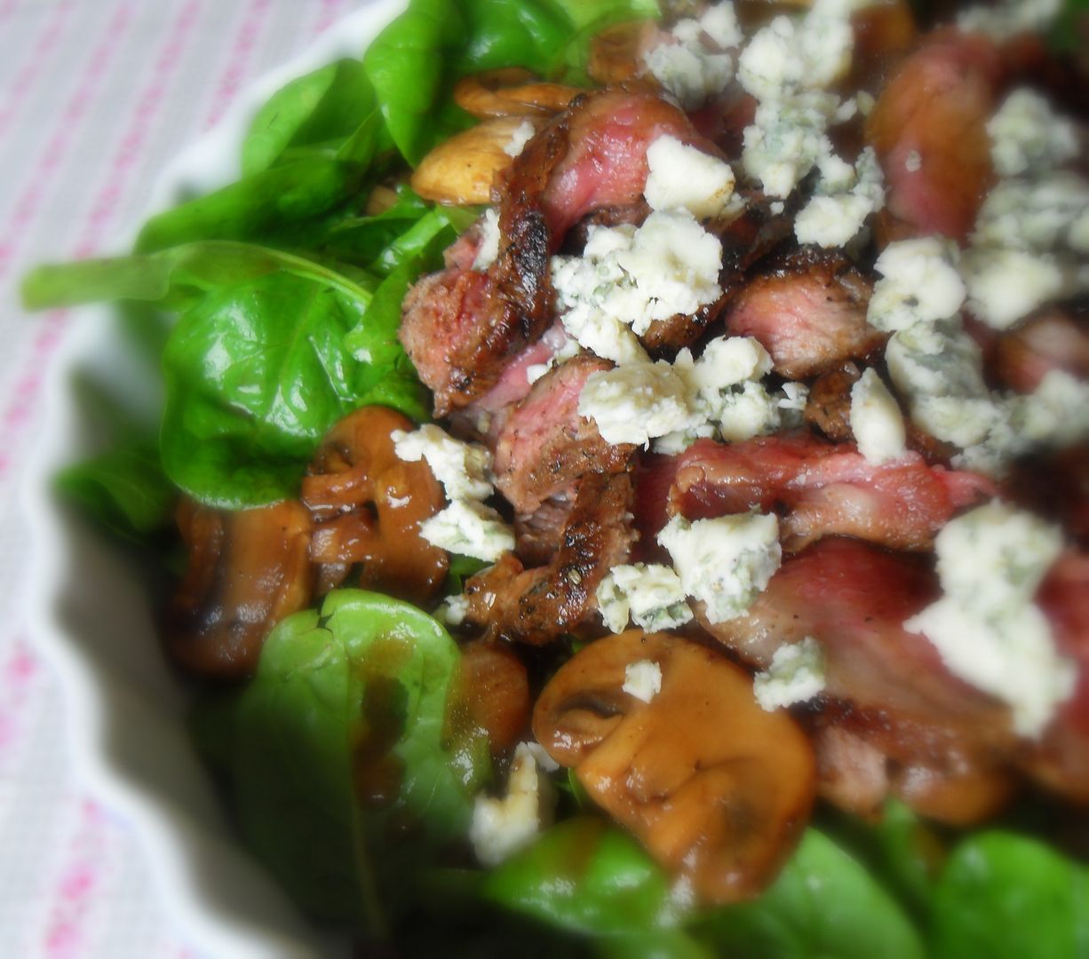 You get the green rich and meaty crunch of fresh baby spinach leaves . . . the lovely flavour of the steak, the tang of capers and blue cheese . . . rich mushrooms and a lovely vinaigrette, which when combined together create a fabulous salad that I would even serve to company.