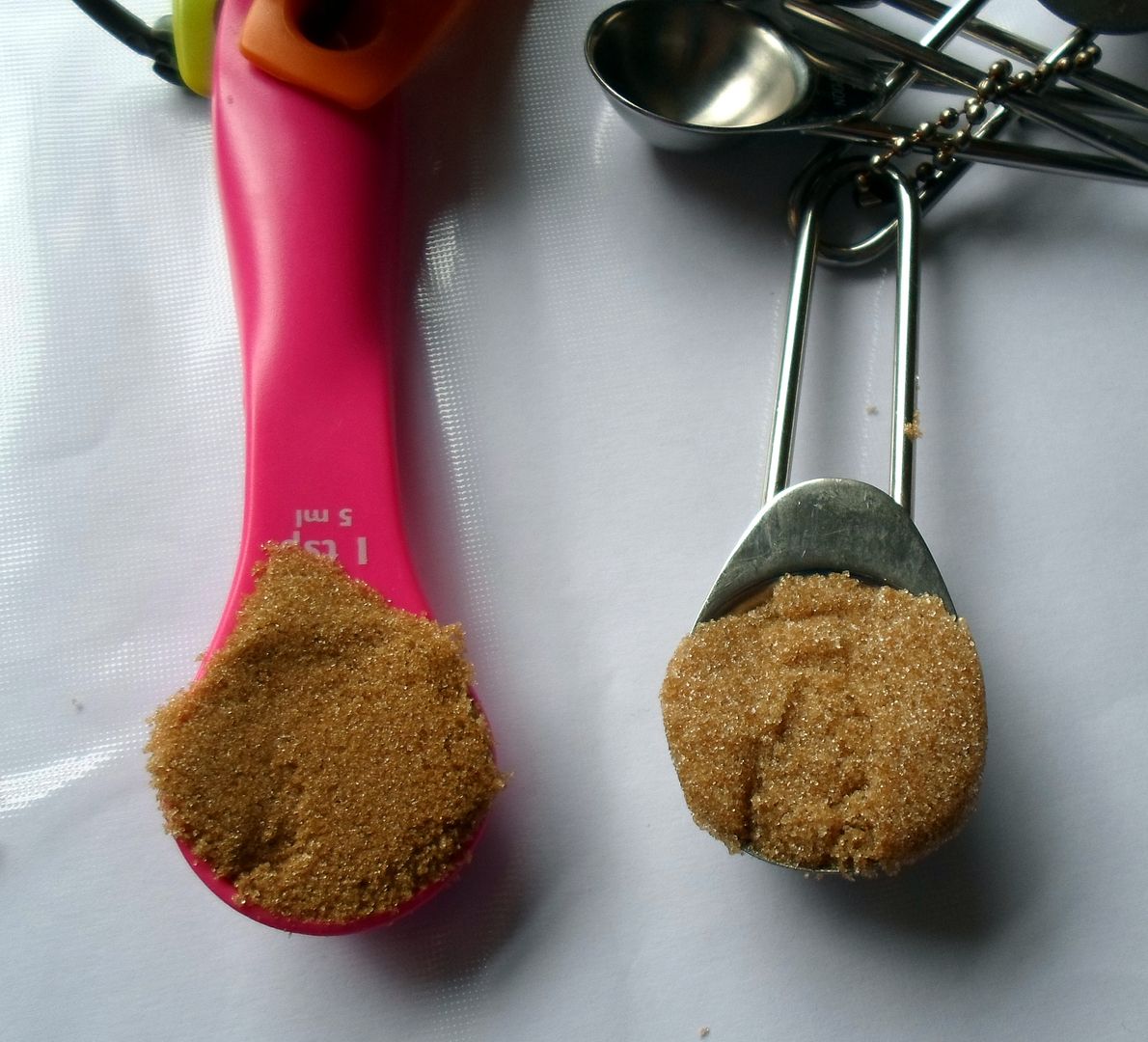 I took two teaspoons of brown sugar. One teaspoon held the Billington's Light Muscovado brown sugar. The other one held an ordinary brand of soft light brown sugar. (Thankfully they had sent me a small amount of an ordinary brand of soft light brown sugar. I quite honestly never have anything but muscovado sugar in the house.)The visual difference between the two is quite noticeable to me.