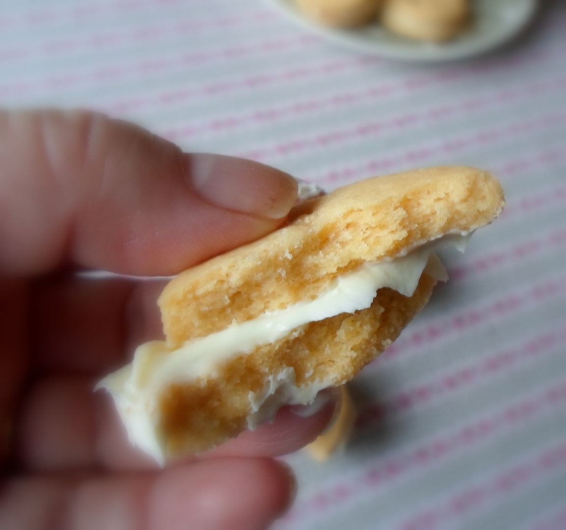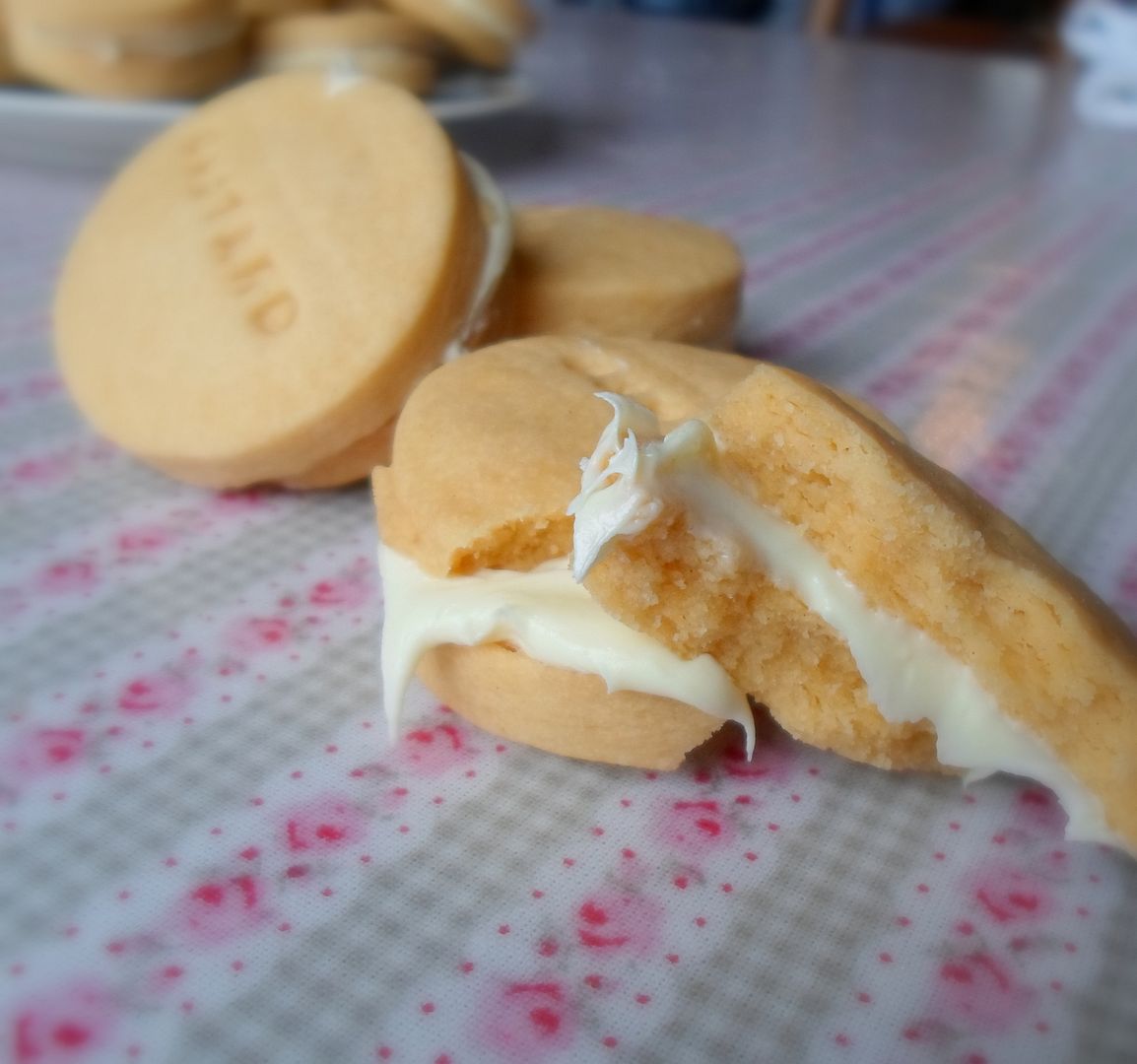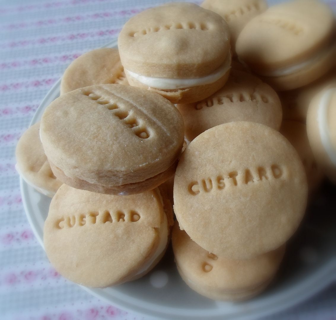 Buttery short biscuits, with a crumbly texture . . . lightly flavoured with custard powder . . . and then filled with a custard flavoured buttercream icing.