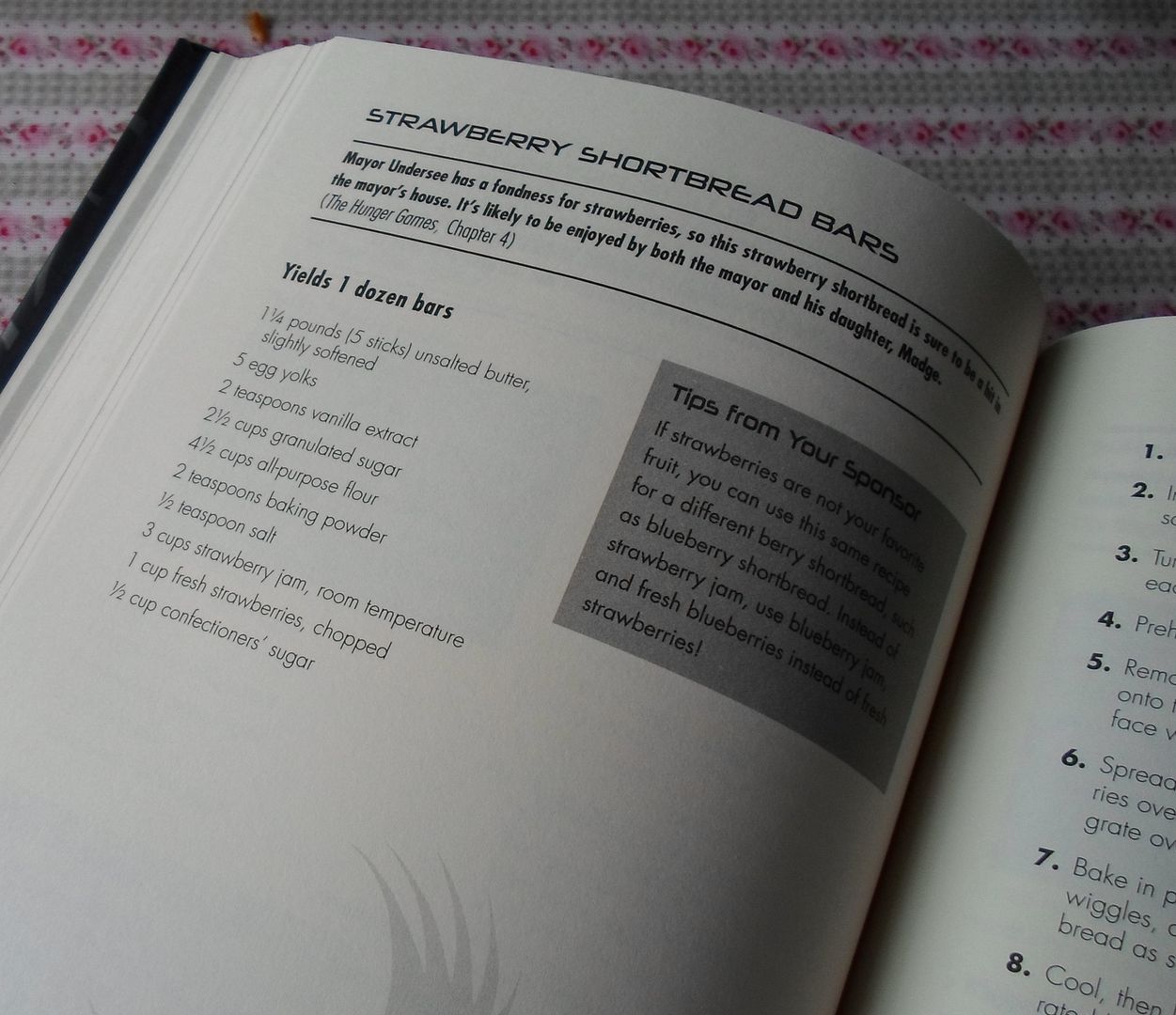 Each recipe seems to be well written, with great instructions and tips included from your "Sponsor." The downside is that there are no photographs at all, and I do love my cookbooks to have at least a few scrummy pictures. But, aside from a few recipes I would probably never cook, like "Fightin' Fried Squirrel . . . there are also a great number of really delicious sounding ones like Mixed Messages Mixed Berry Jam, Apocalyptic Eggs Benedict, Katniss's Craved Cheese Buns, Harvest Heirloom Apple Cake and Thick and Gooey Double Chocolate Banquet Brownies. Again, I haven't cooked anything from this book . . . but I probably will. It's been hard these past three weeks getting in any cooking time with all the renovations going on. I am giving this one an "8". Pictures would be nice, but most of the recipes sound quite delicious and it has great novelty factor. It would make a perfect gift for the Hunger Games fan!