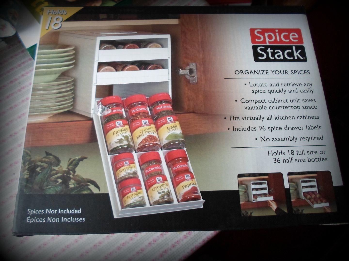 It's called the Spice Stack! A handy dandy plastic cabinet, guaranteed to fit in virtually all kitchen cabinets, saving valuable counter-space. It holds 18 full size spice bottles or 36 half size bottles and includes 96 spice drawer labels.