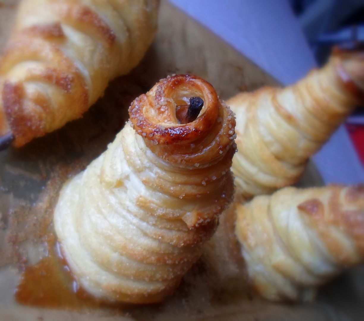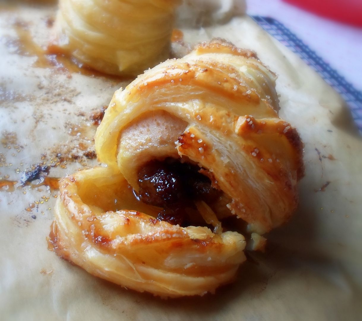 Peel your pears and cut a slice off of the bottom of each so that they will stand upright. Using the small end of a melon baller, go in through the bottom and scoop out the seeds, discarding them. Stuff this core with mincemeat. Place each stuffed pear onto one square of the puff pastry. Brush the remaining puff pastry with the beaten egg and cut into narrow, long strips, about 1/3 inch in width. Wind the pastry squares around each pear, folding the edges of the squares on the bottom up inside and covering the pears completely, leaving just the stem sticking out the top. Sprinkle with demerara sugar.