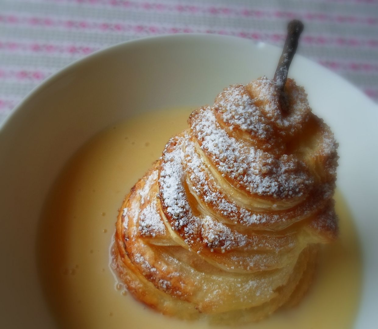 Bake for 15 to 20 minutes in the heated oven until golden brown. Remove from the oven. Allow to cool for several minutes. Dust with icing sugar. Lift each pear carefully into a dessert bowl. Ladle warm custard around and serve.